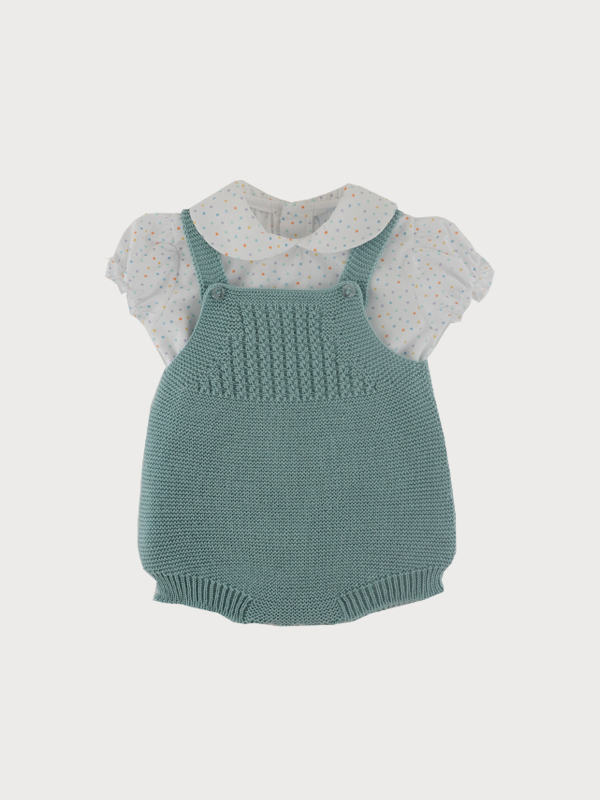 Completo due pezzi: camicia fondo bianco con pois colorati e salopette in maglia verde acqua