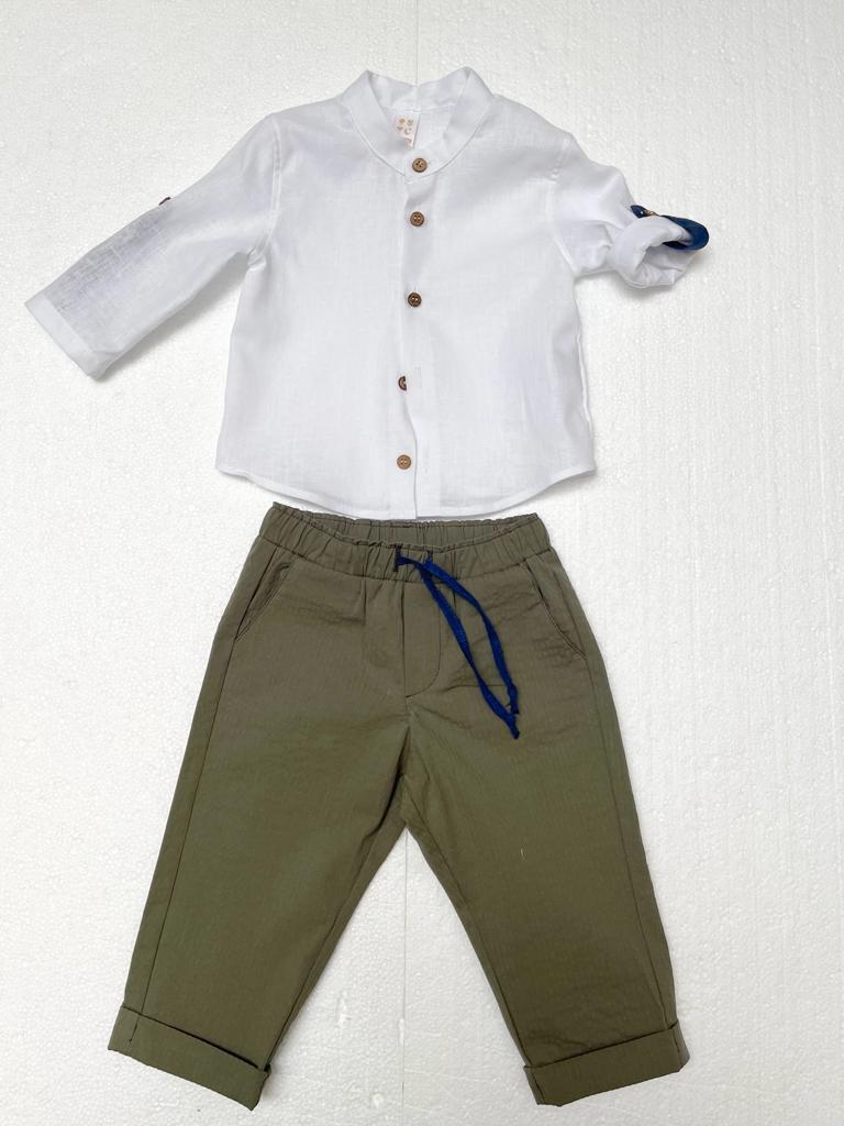 Camicia bianca in lino con colletto alla coreana e pantalone in cotone con coulisse colore verde militare