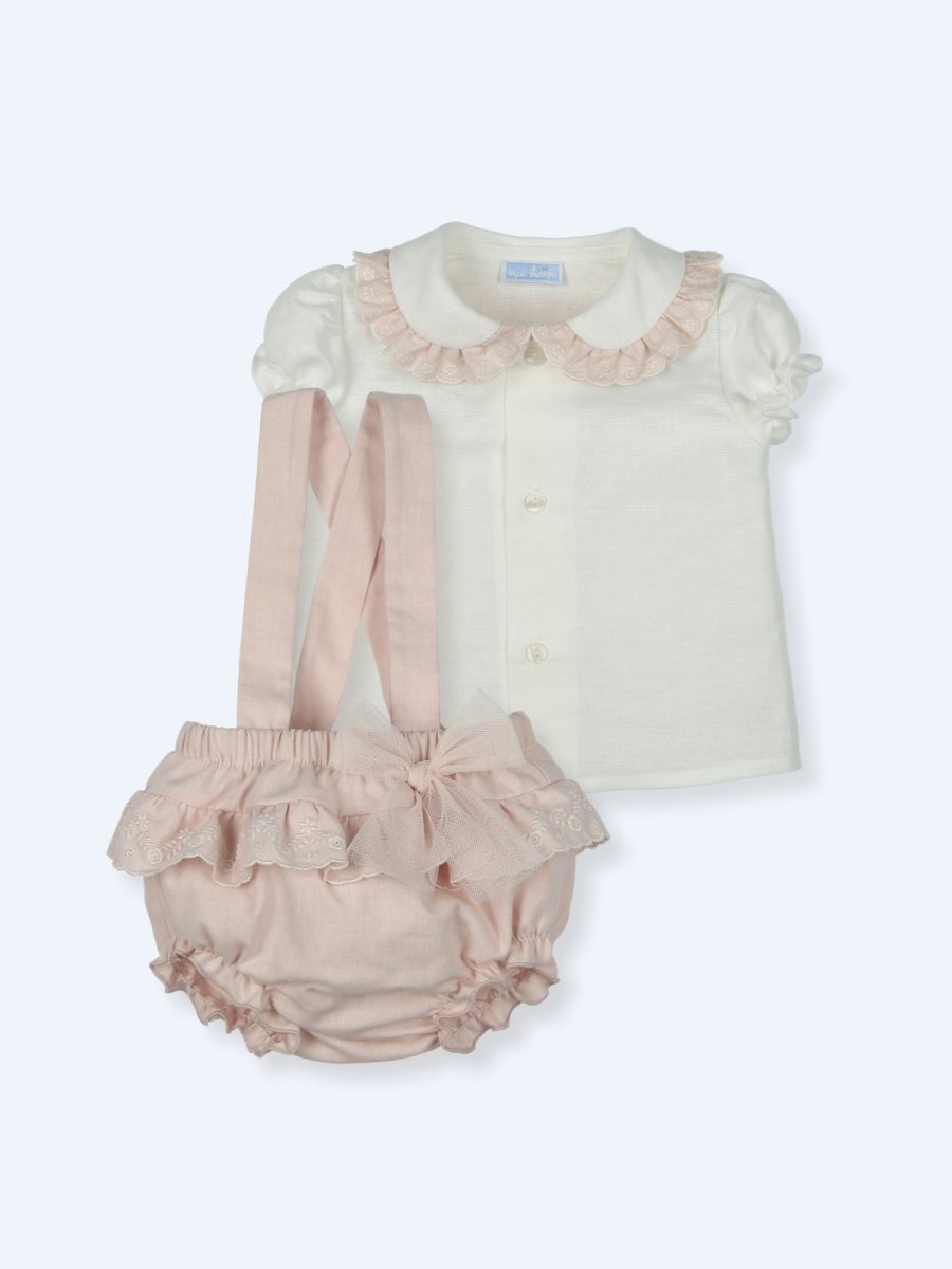 Completo due pezzi: camicia a mezza manica bianca con colletto ricamato rosa e salopette rosa con balza ricamata e fiocco in tulle