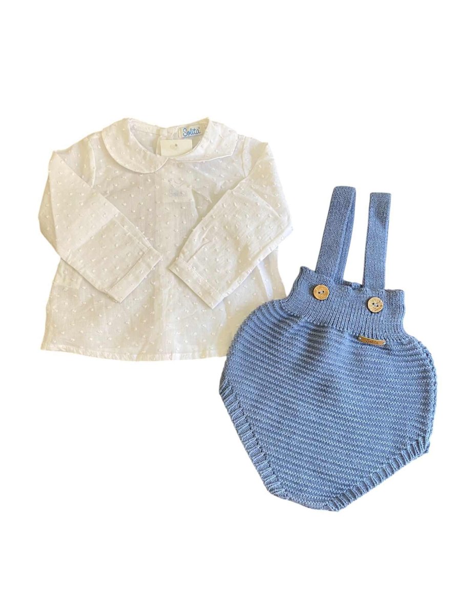 Camicia a manica lunga in cotone colore bianco ricamo plumetis e salopette in misto lana colore blu avion con bottoncini in legno