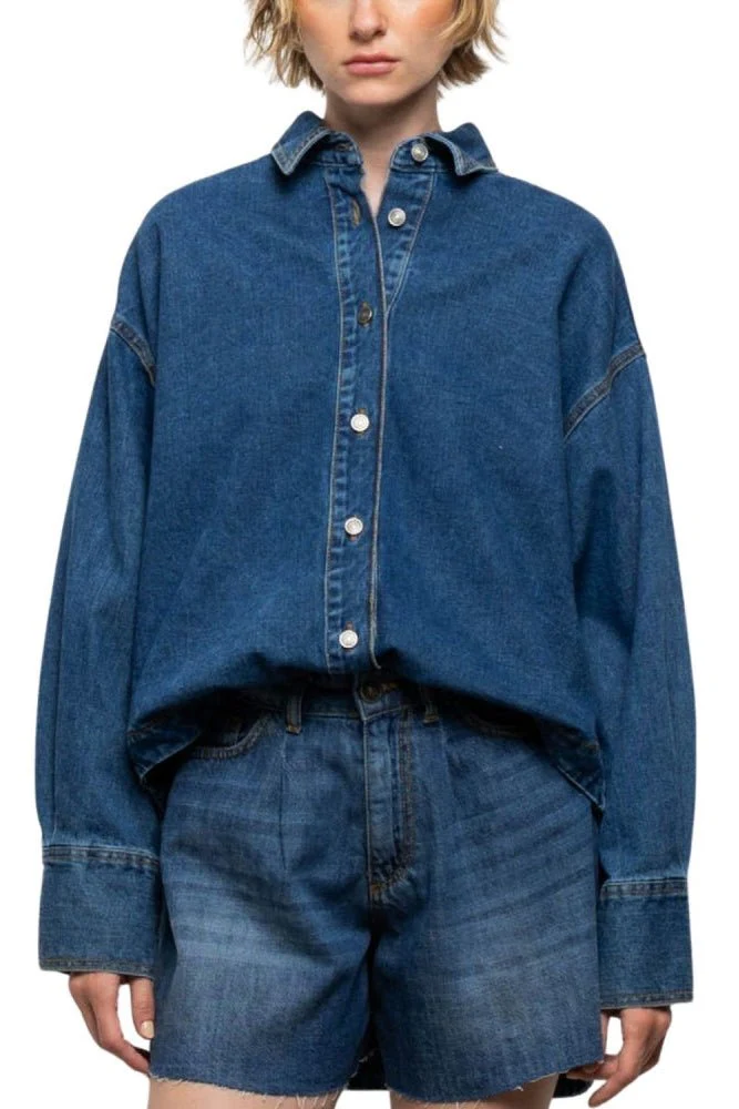 Camicia di jeans, con colletto classico, bottoni in metallo, bugia e fondo piรน lungo sul retro. Vestibilitร over.