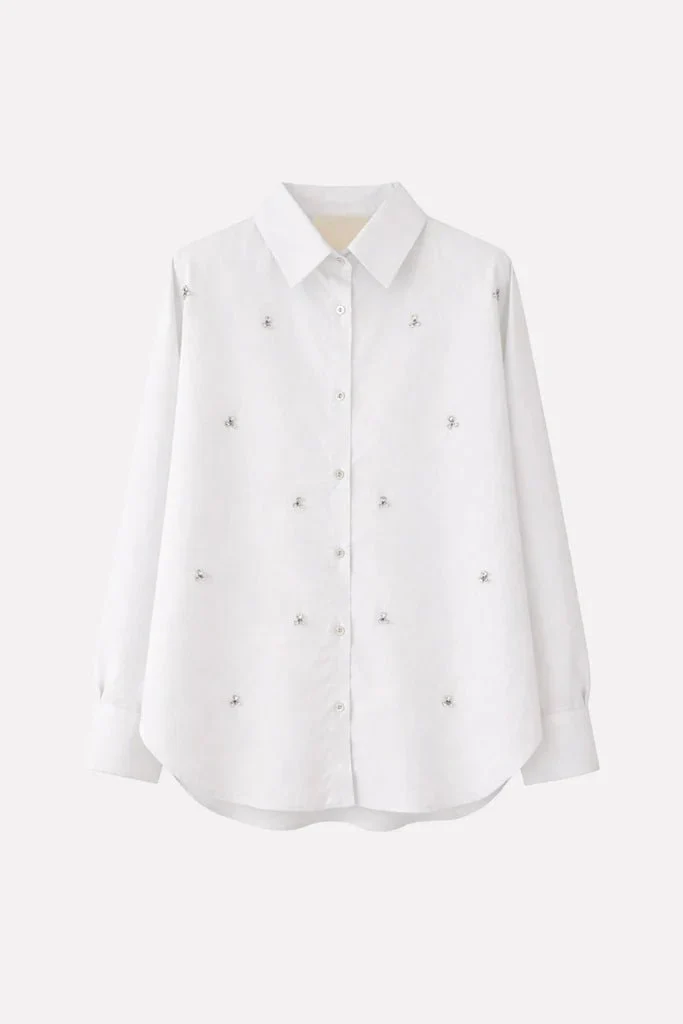Camicia da donna in cotone con fit morbido. Modello con colletto classico, chiusura frontale con bottoni e applicazioni decorative sul fronte. Leggera e versatile, ideale per look casual raffinati.