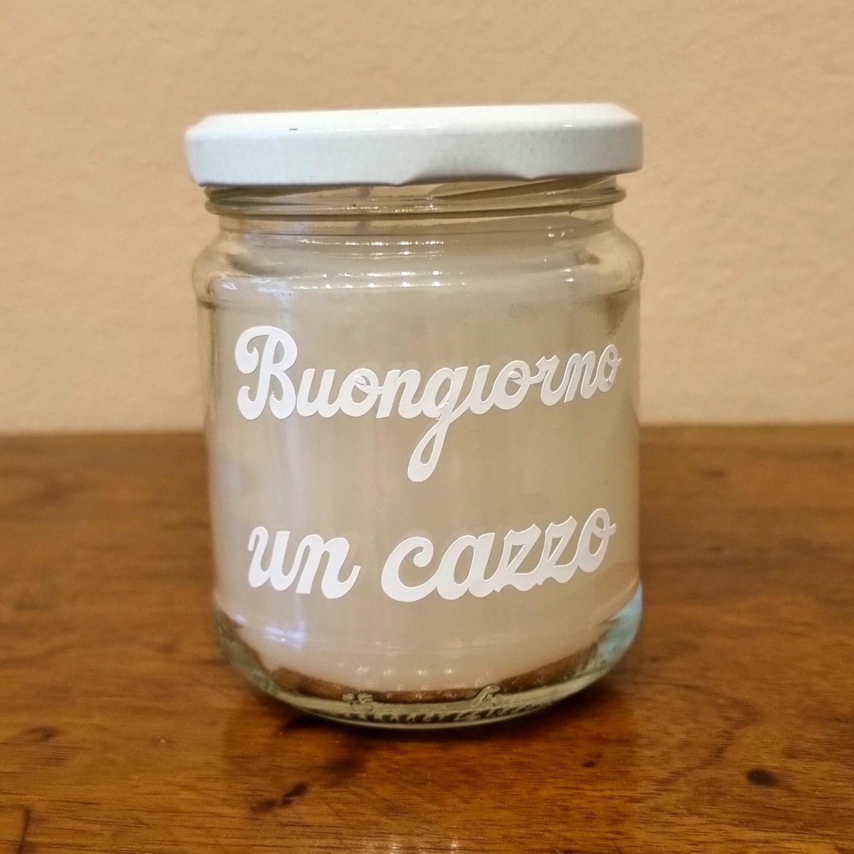 [/vc_column_text][vc_empty_space][vc_column_text]CANDELE COLORATE IN VASETTO DI VETRO MISURE 7L x 7l x 8H cm con stampa frase divertente