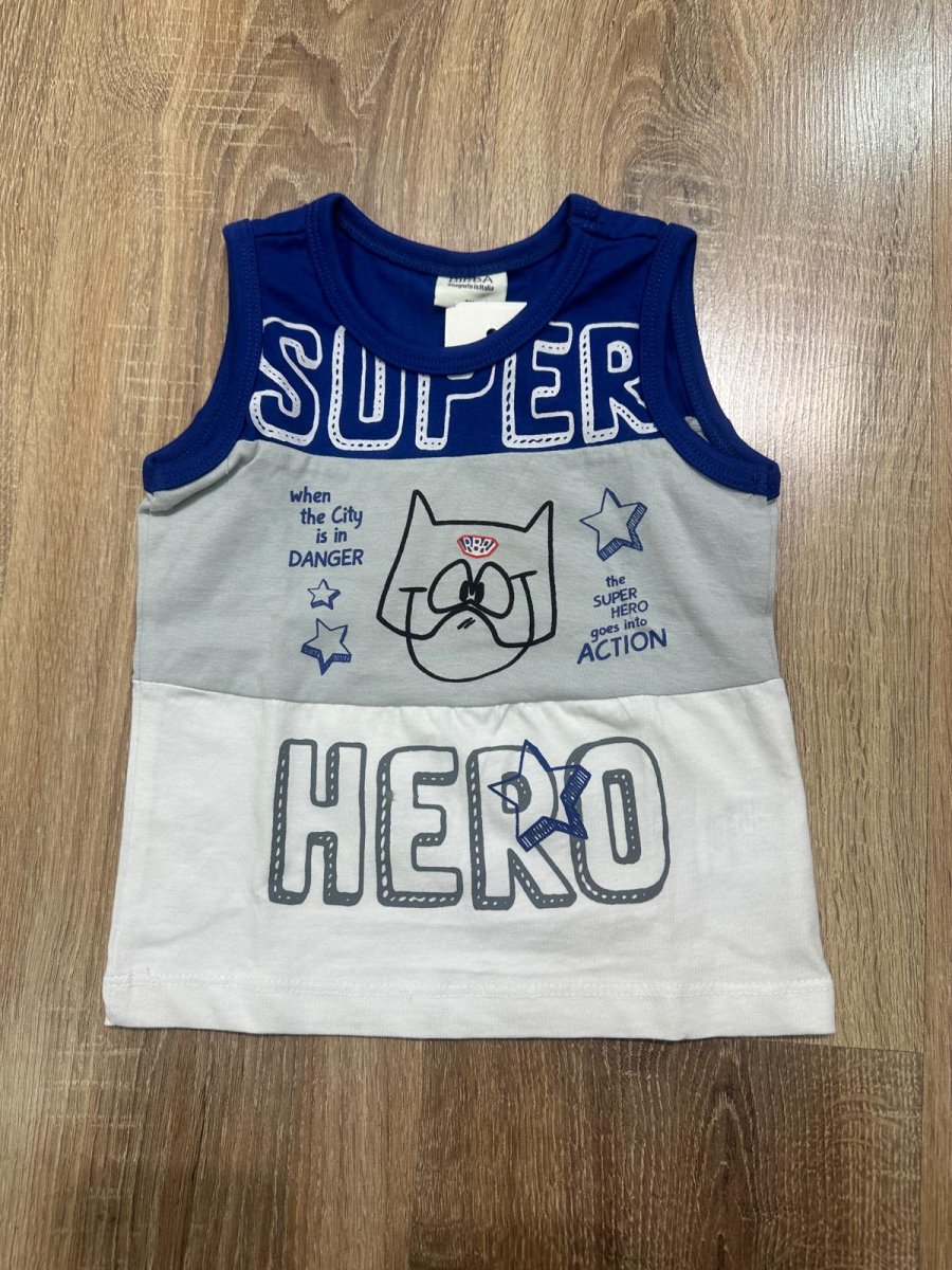 Canotta Birba, in cotone, blu,grigia e bianca con stampa Super Hero