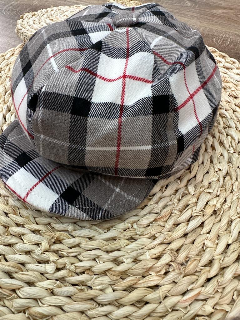 Cappellino basco fantasia tartan tortora bianco nero e rosso TG. II (48cm) – III (50cm)