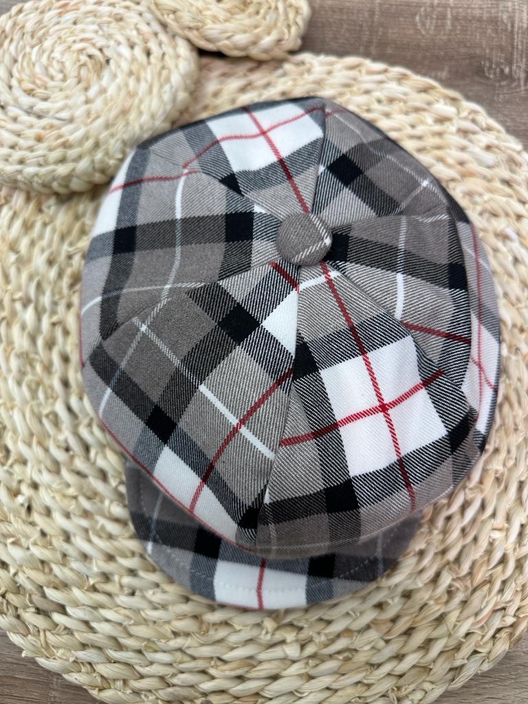 Cappellino basco fantasia tartan tortora bianco nero e rosso