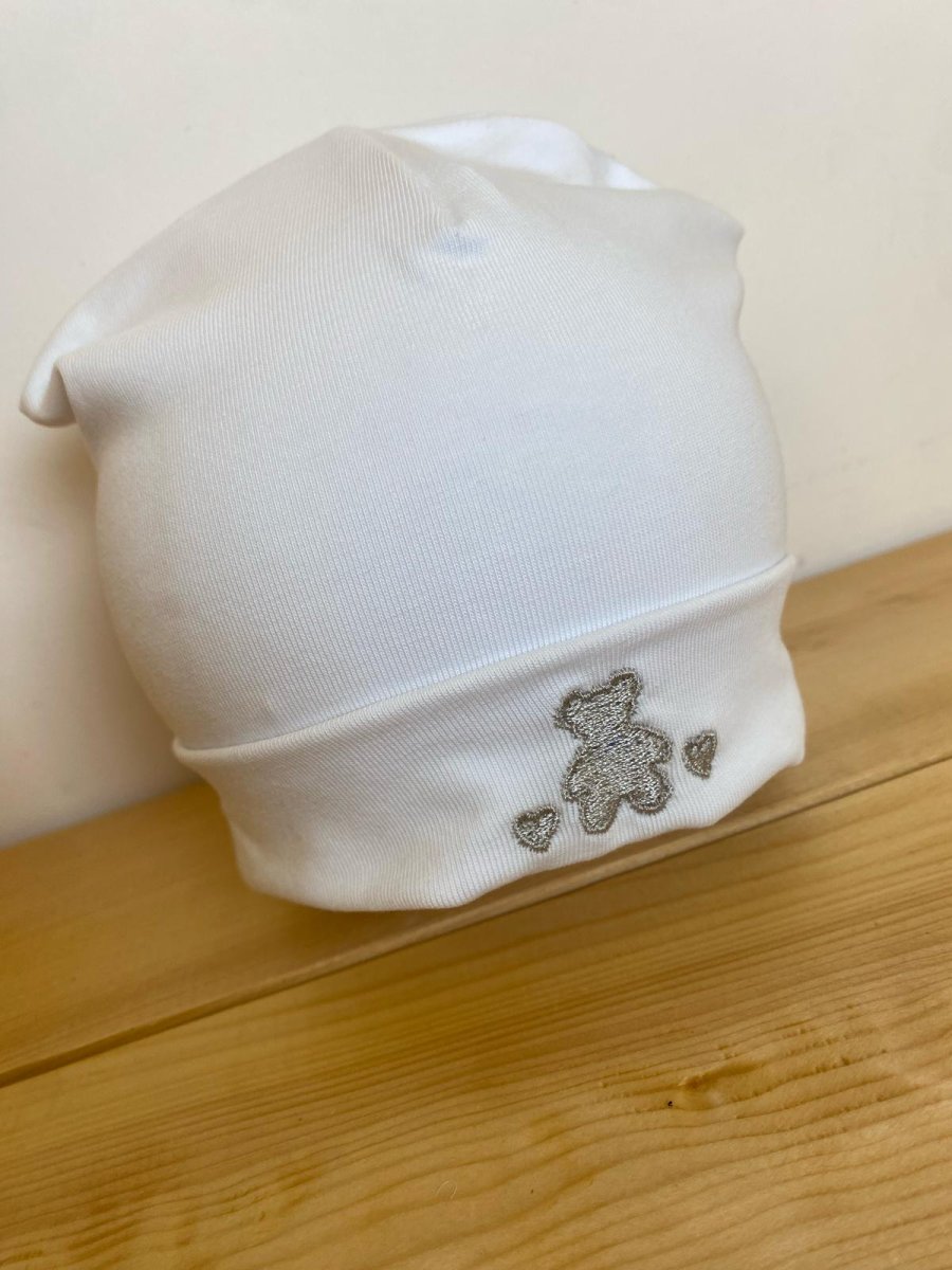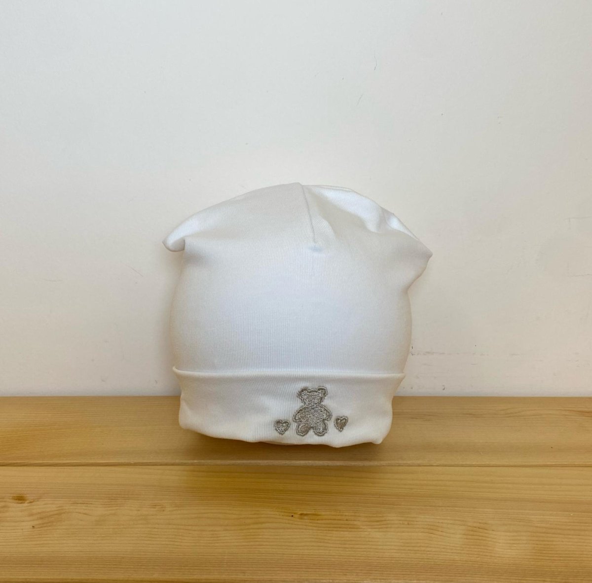 Cappellino in cotone colore bianco con ricamo cuoricini rosa e orsetto tortora
