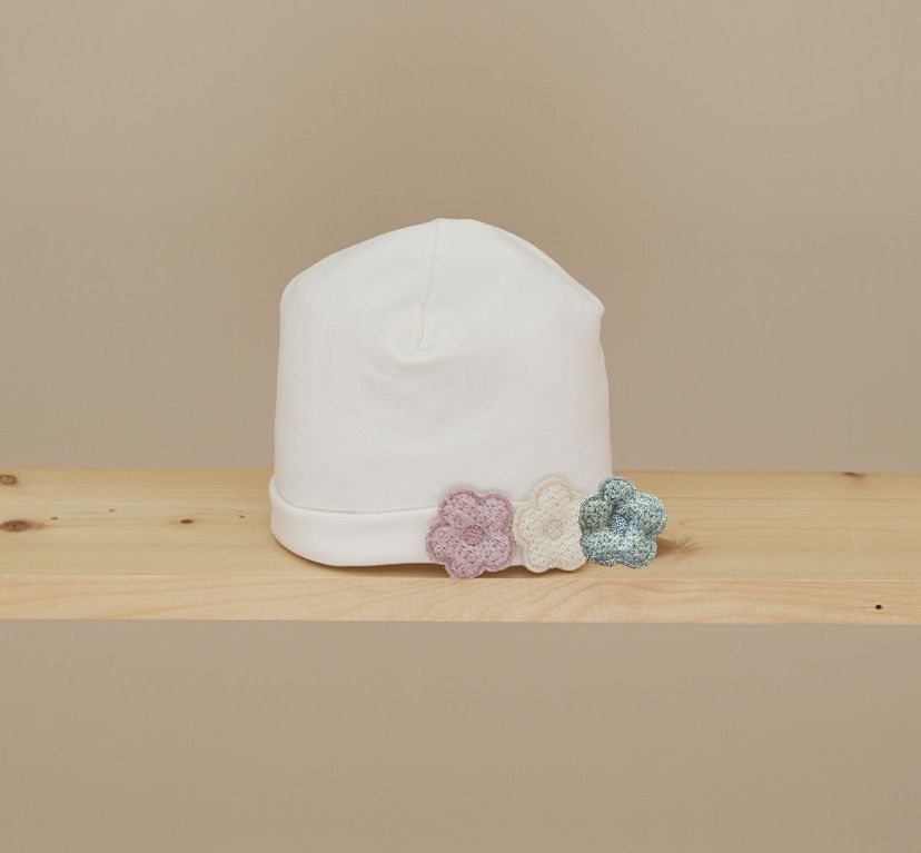 Cappellini in ciniglia colore panna con applicazione fiorellini rosa, panna e verde