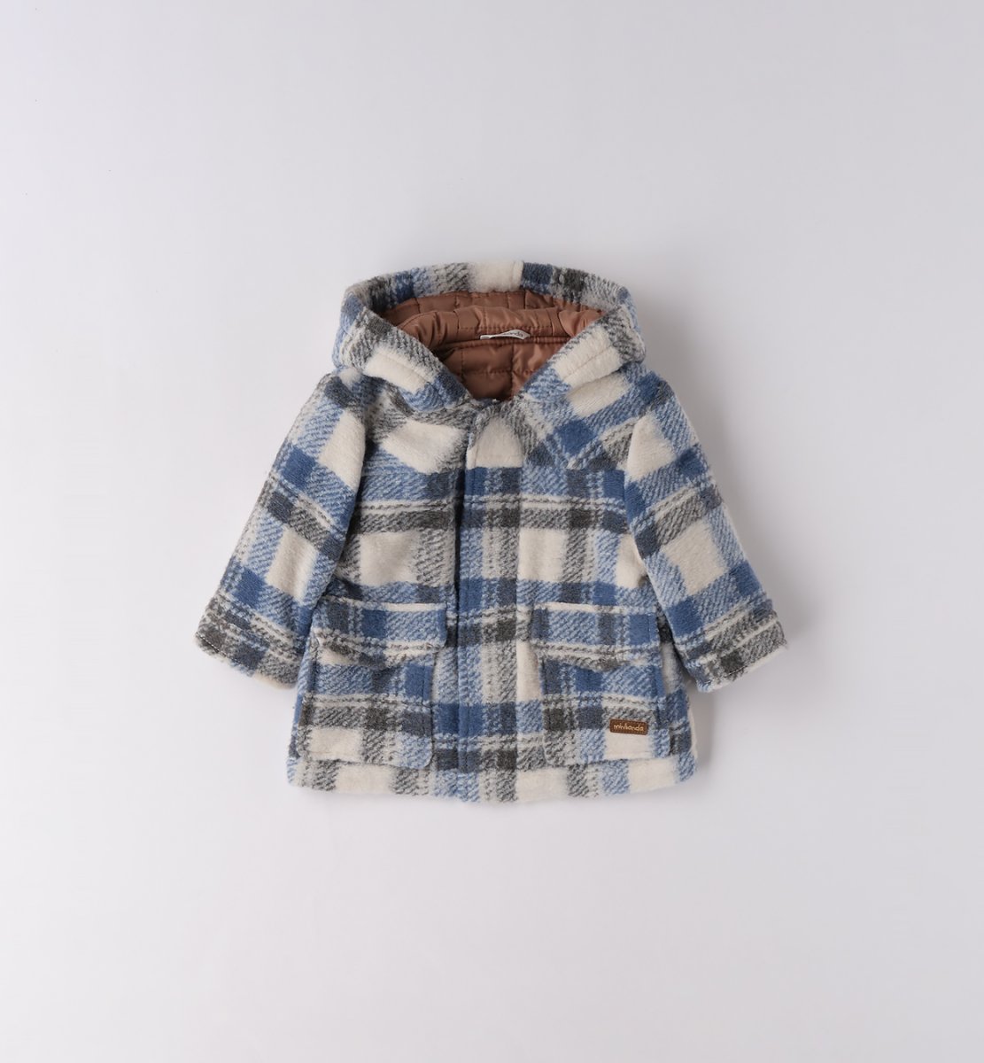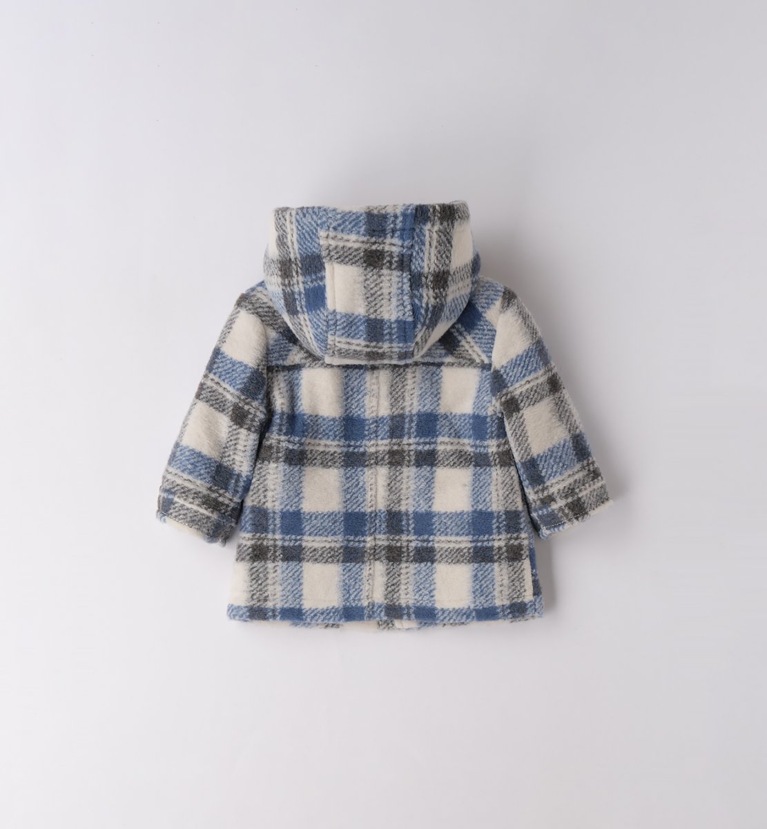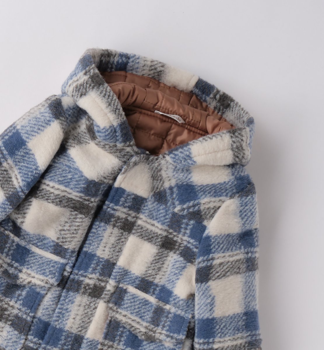 Cappottino in tessuto navetta con cappuccio e tasche colore blu, panna e grigio, trapuntato internamente colore marrone