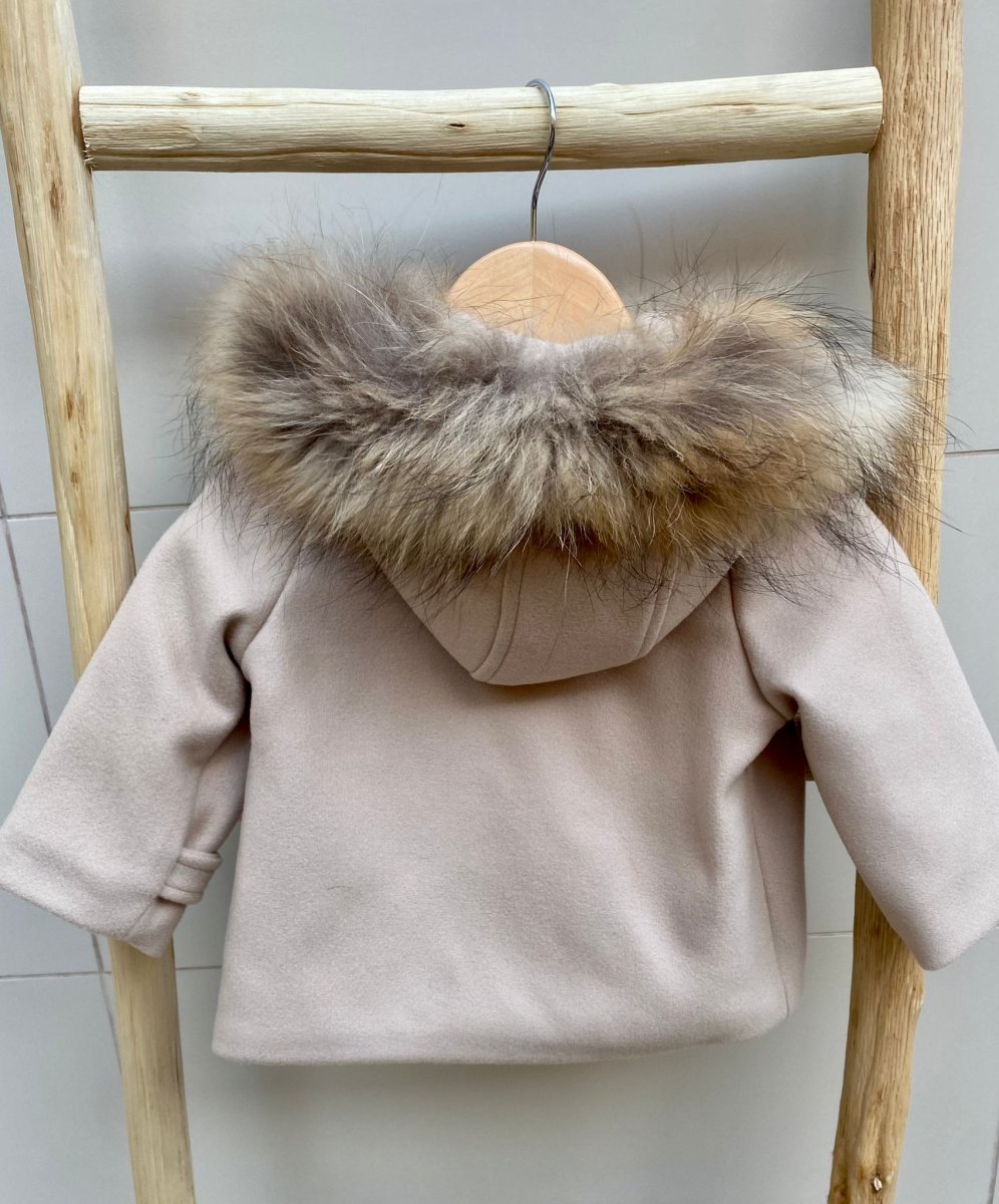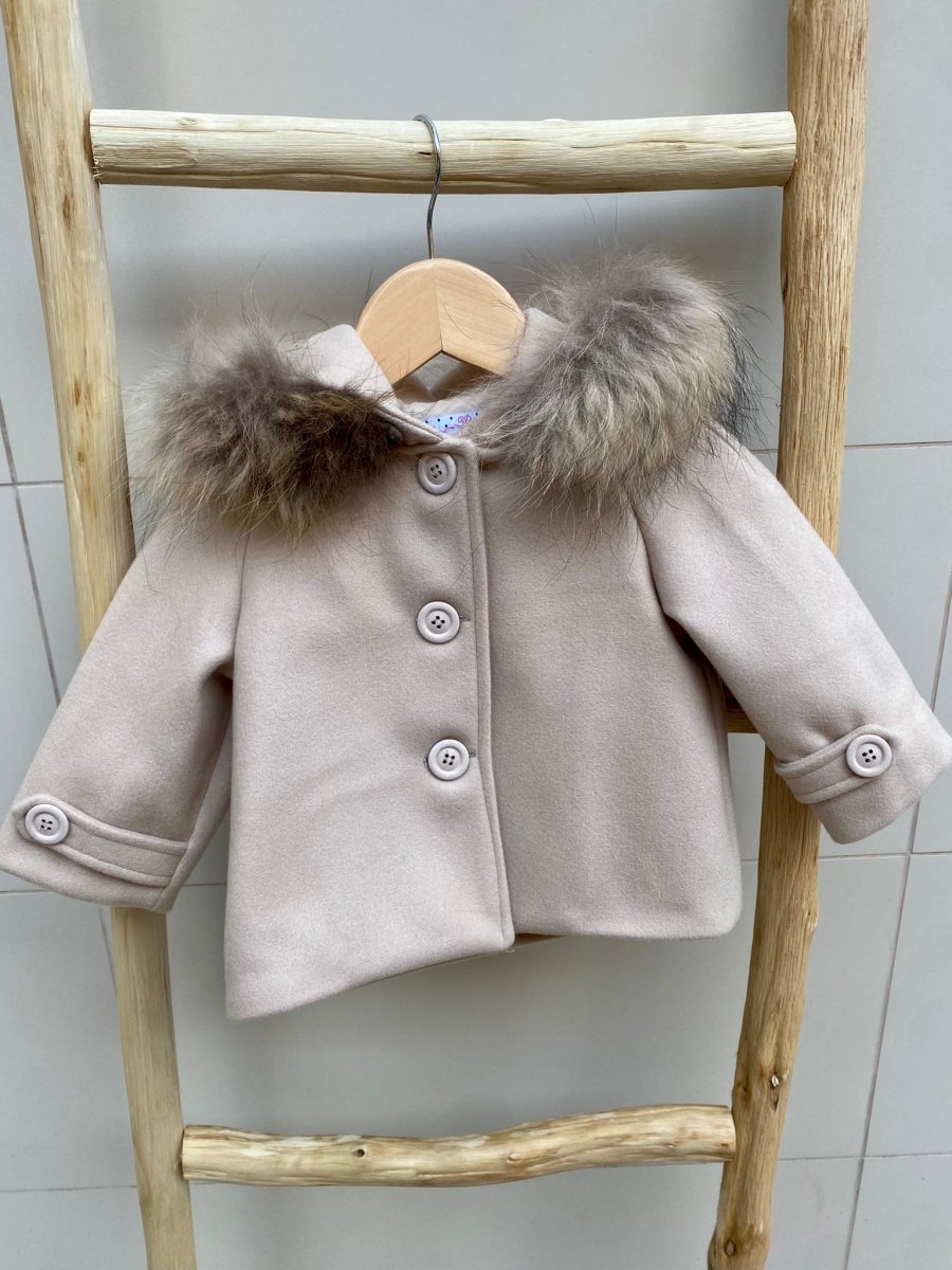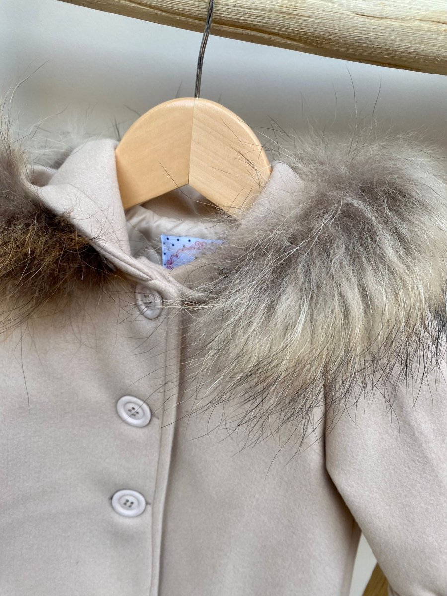 Cappottino in panno beige, con cappuccio di pelliccia rimovibile, chiusura con bottoni