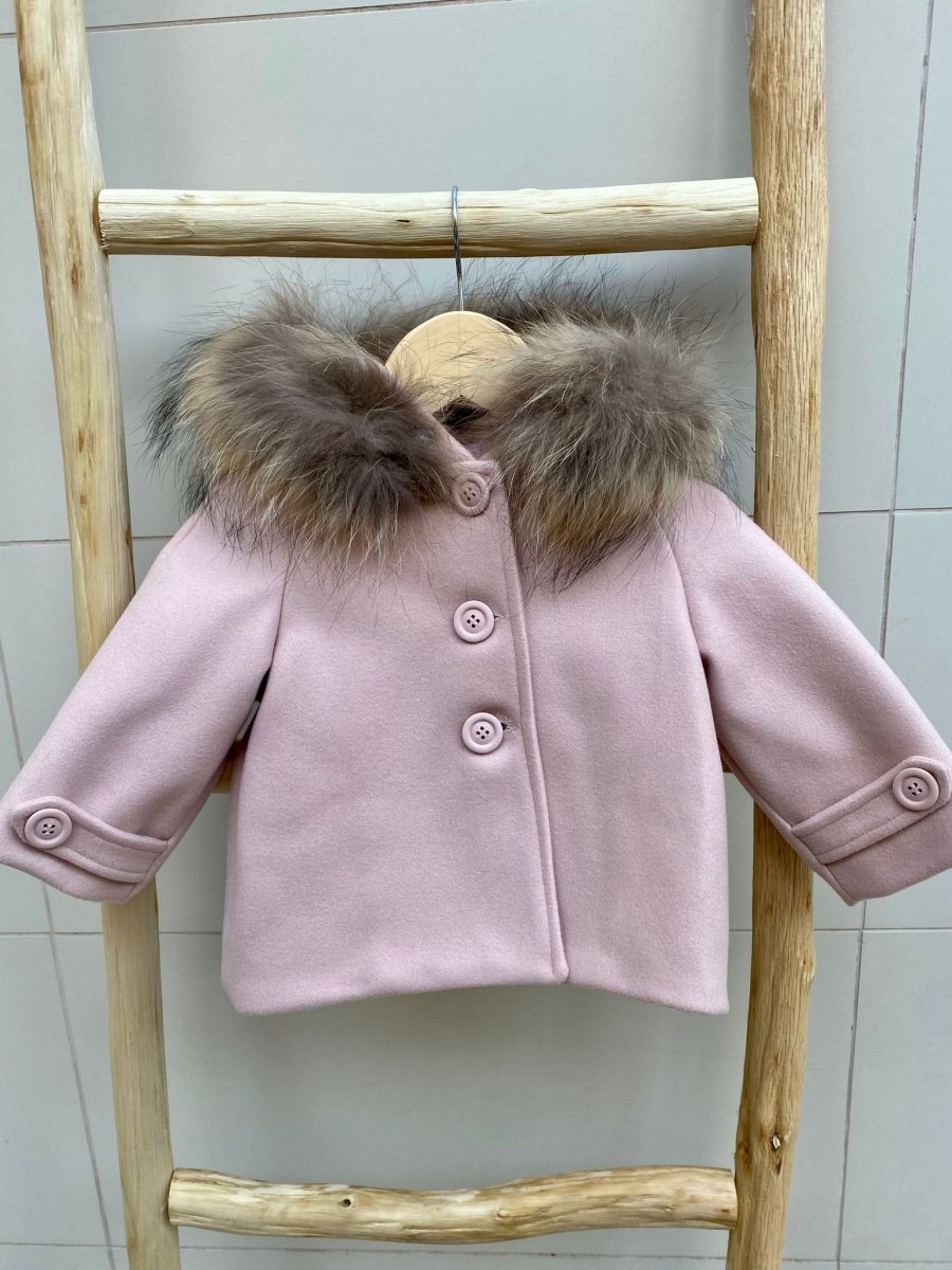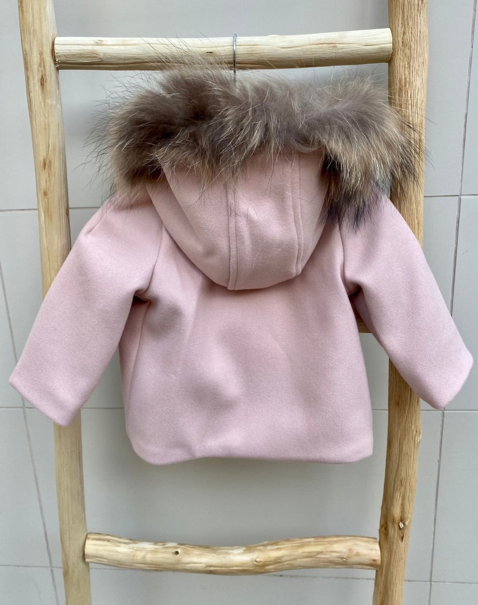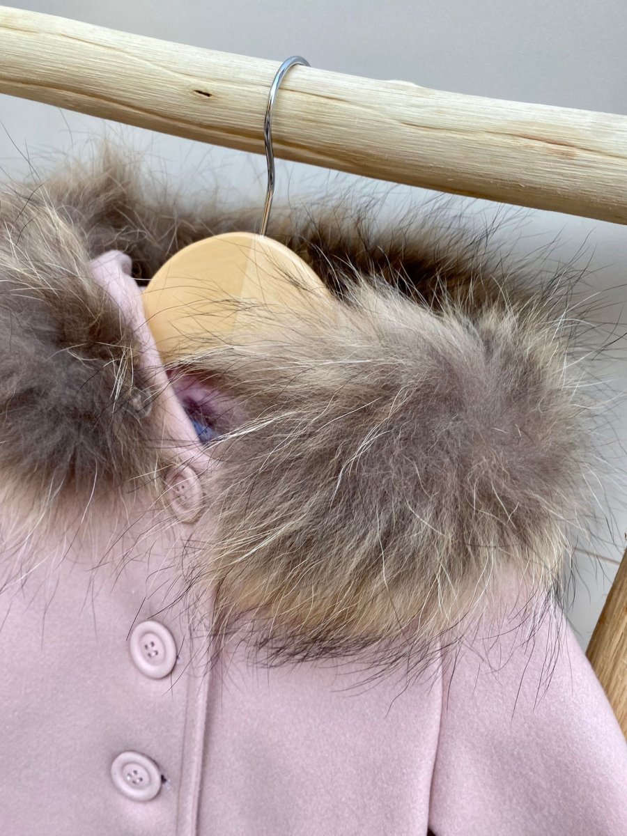 Cappottino in panno rosa, con cappuccio di pelliccia rimovibile, chiusura con bottoni