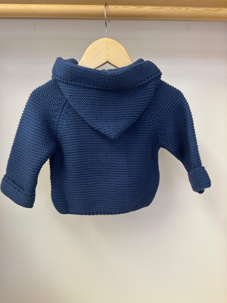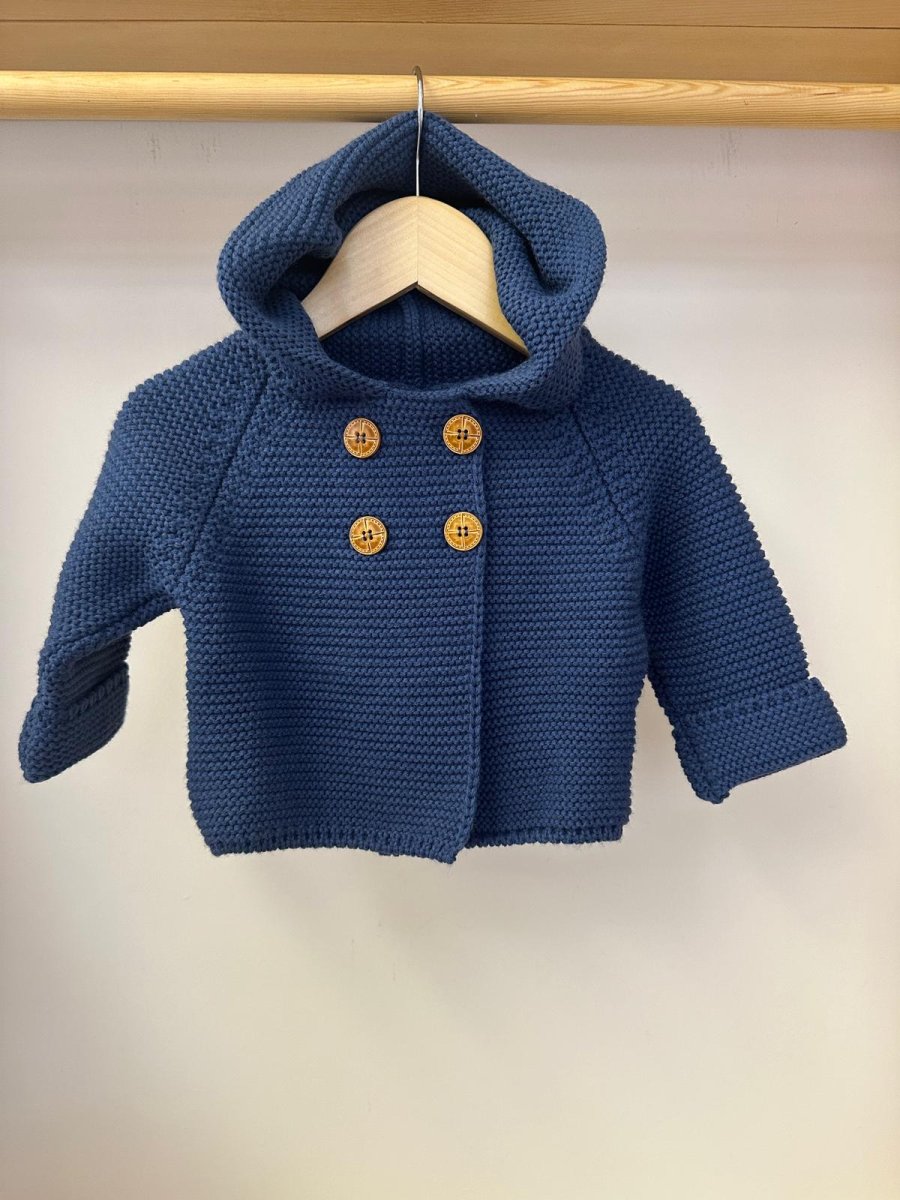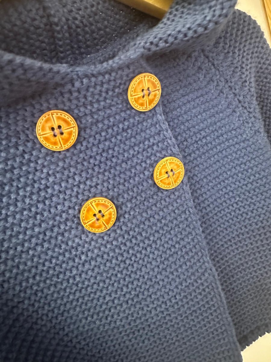 Cappottino in misto lana, chiusura a doppiopetto, bottoncini marroni, con cappuccio, colore blu