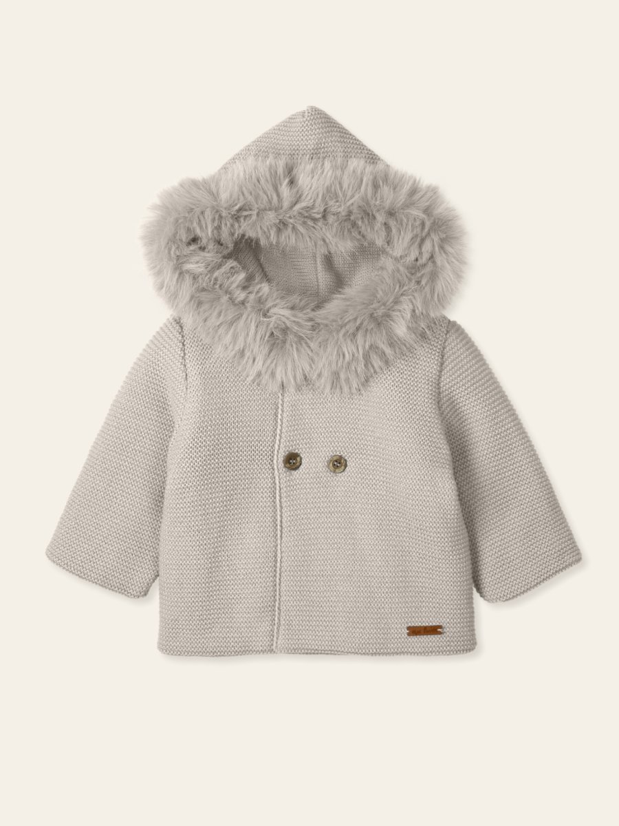 Cappottino in misto lana, cappuccio con pelliccia removibile, colore tortora, abbottonatura a doppio petto