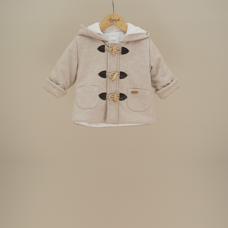 Cappottino modello montgomery con tasche e cappuccio colore beige con pelliccia interna color panna
