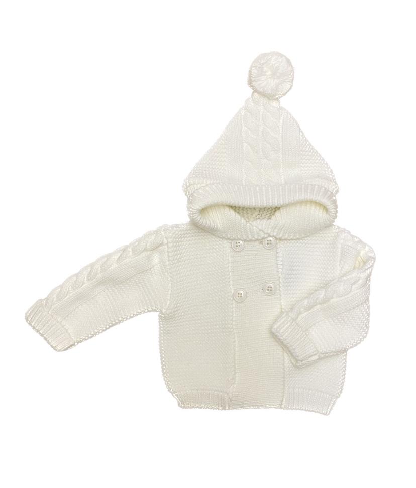 Cappottino in misto lana colore panna con cappuccio pom pom, doppio petto e ricami trecce