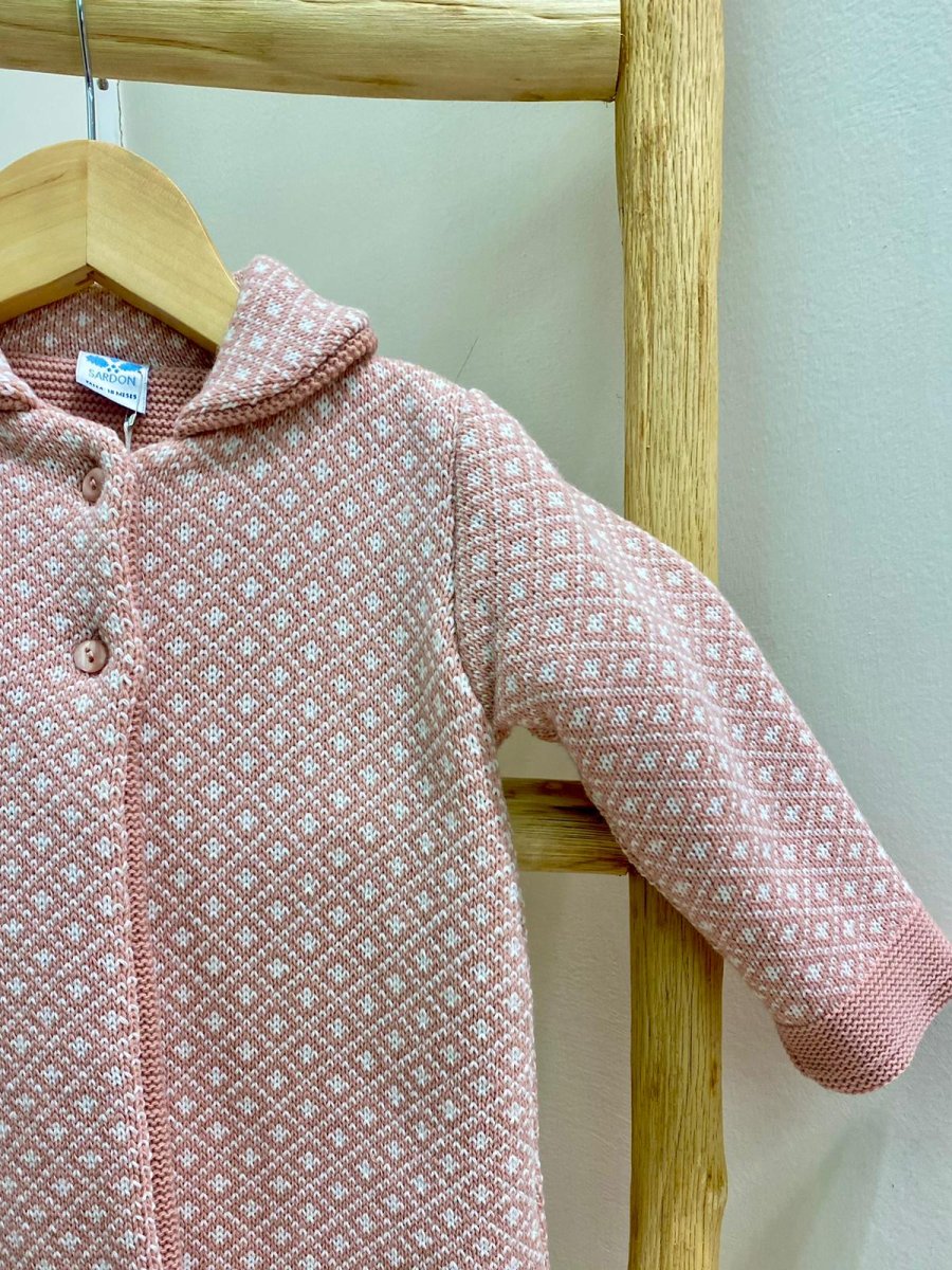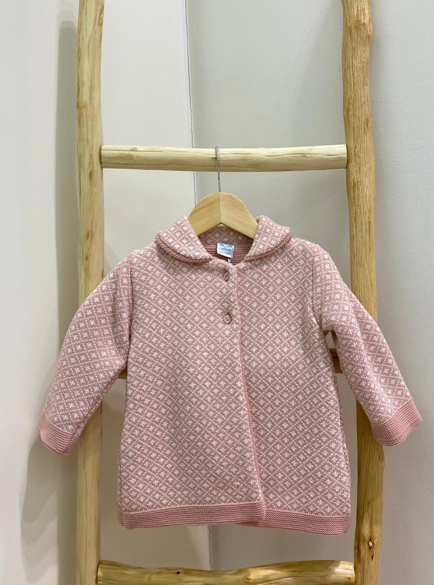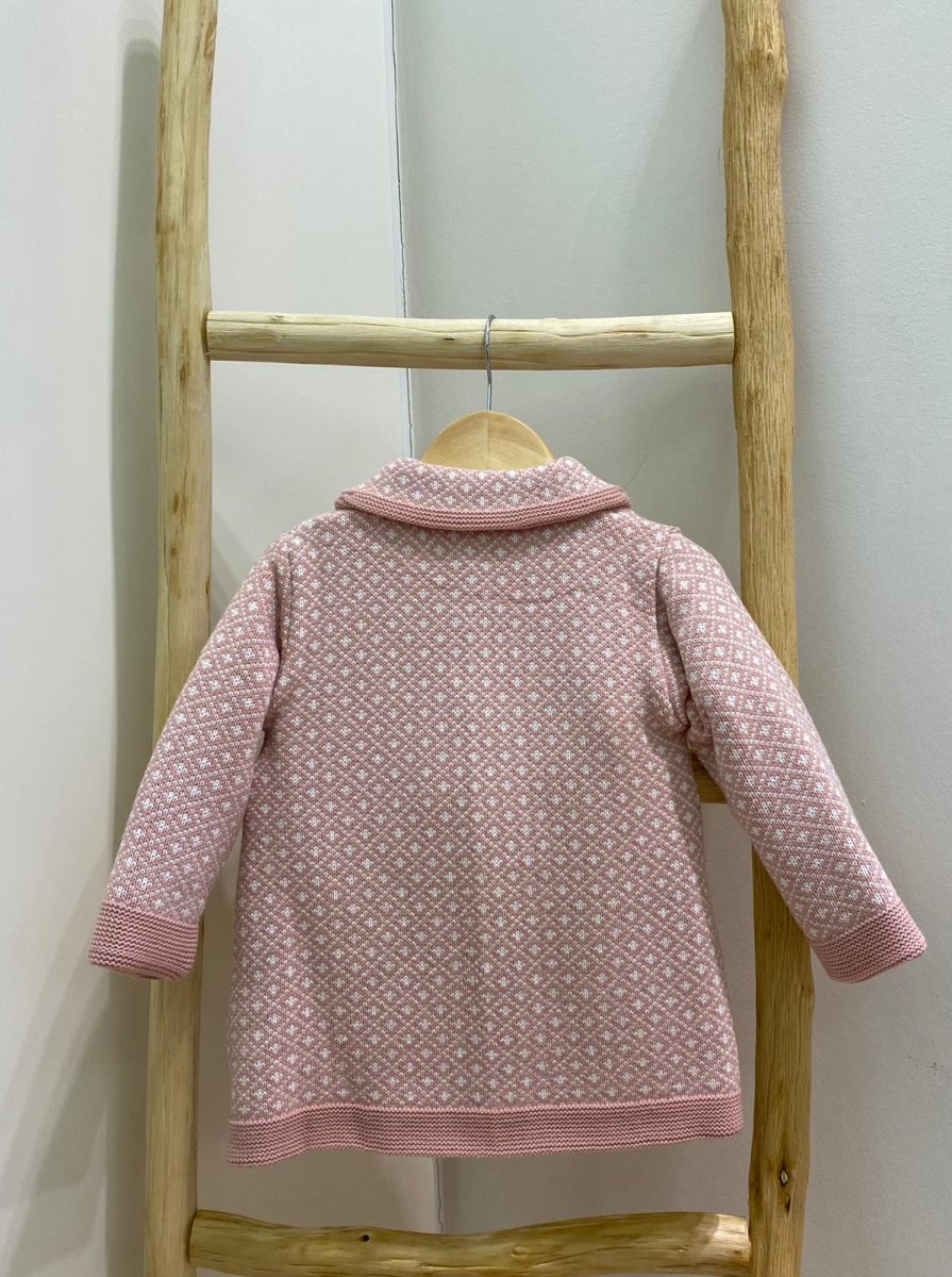 Cappottino colore rosa con ricami bianchi, bottoncini rosa e colletto tondo