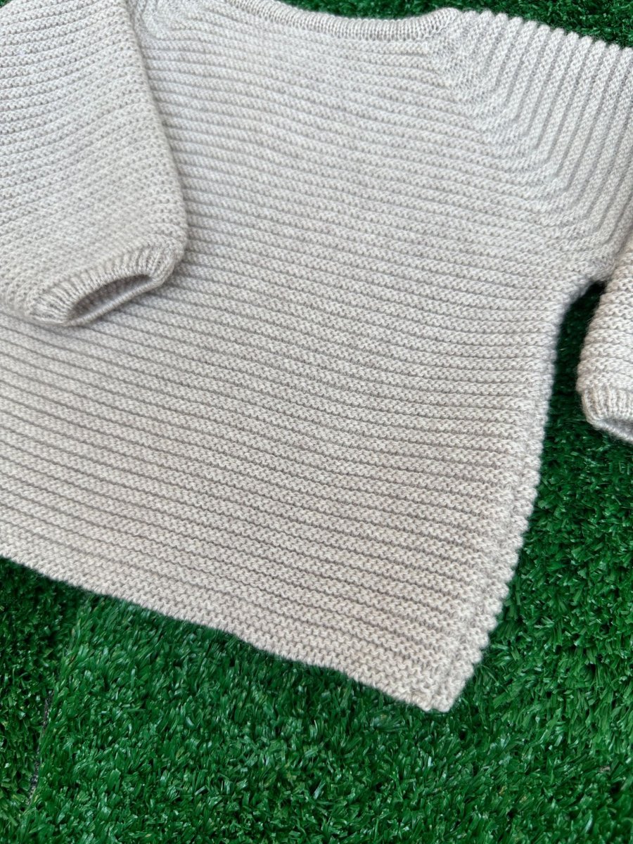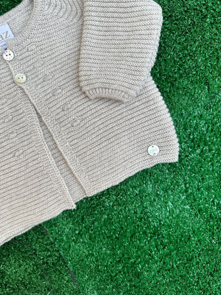 Cardigan in lana merino extrafine color tortora, con bottoncini perlati