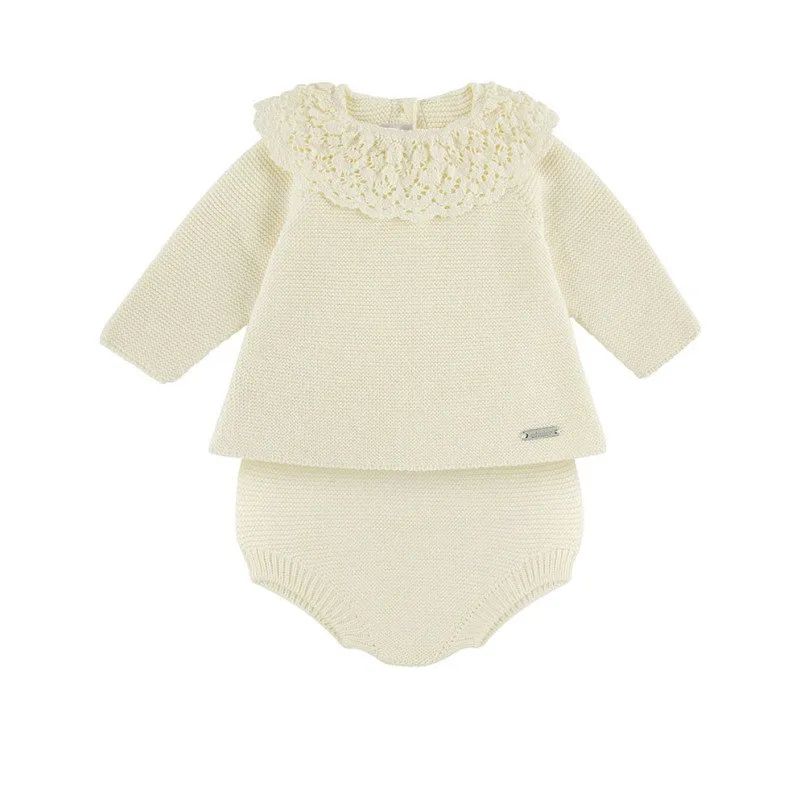 Completo 2 pezzi (maglione + culotte) in caldo cotone con merletto al collo colore panna