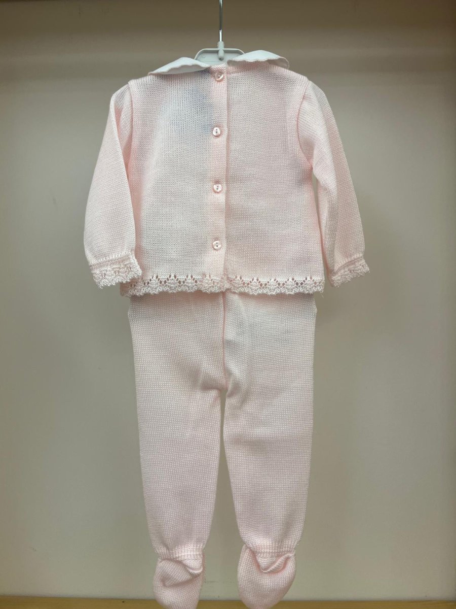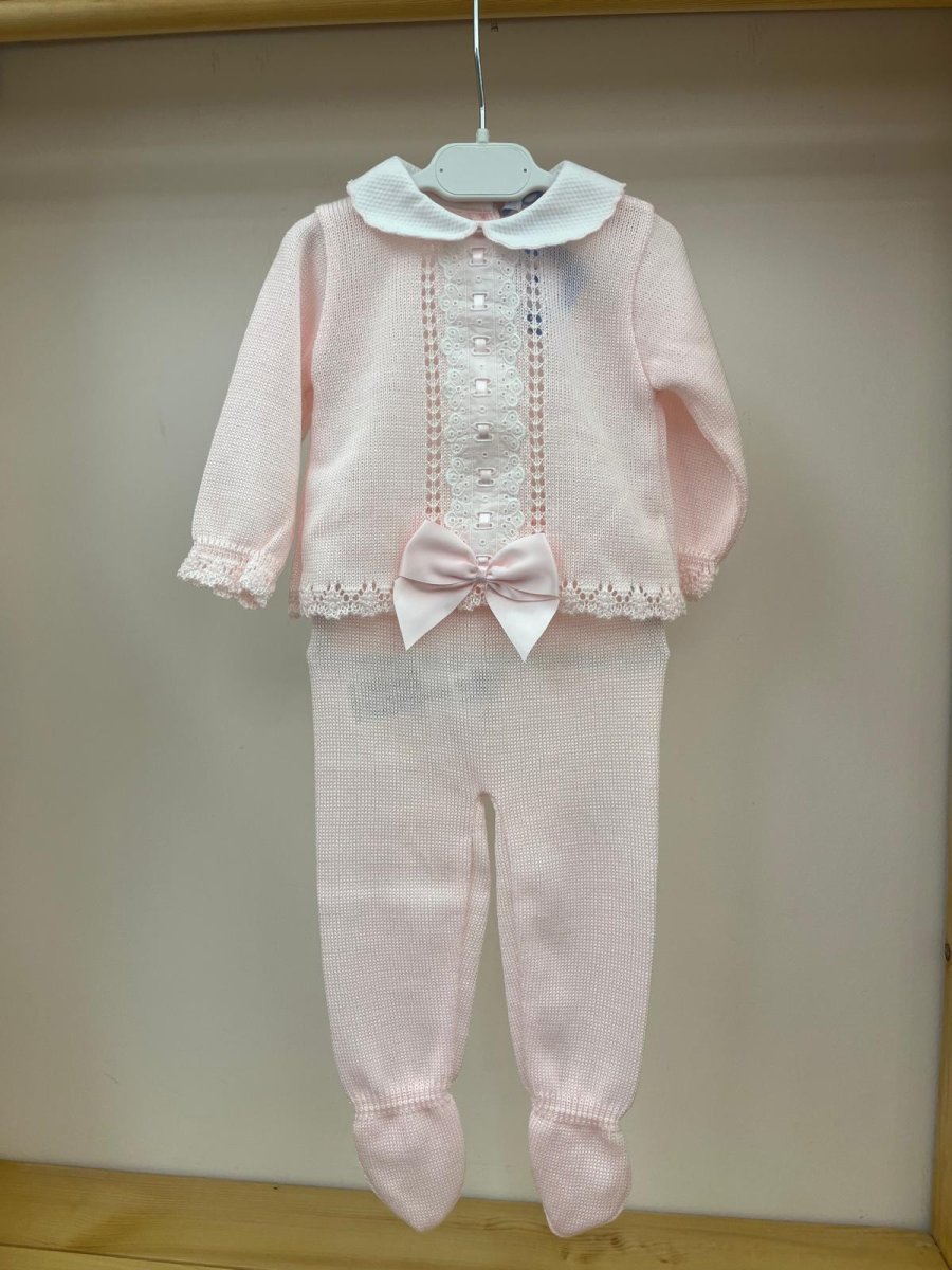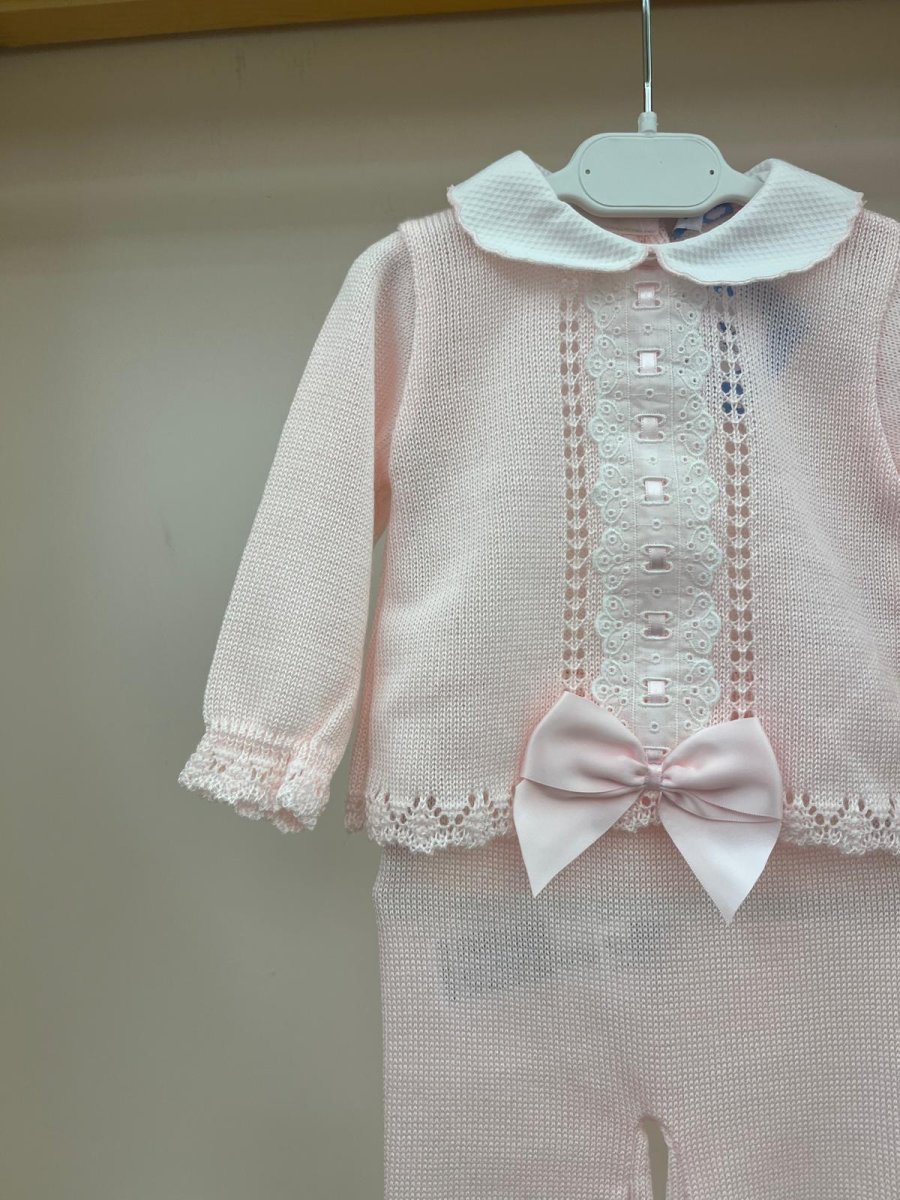 Completo 2 pezzi, maglia rosa con ricamo ed inserto in pizzo bianco sul davanti e fiocco in raso, pantalone con piedino rosa