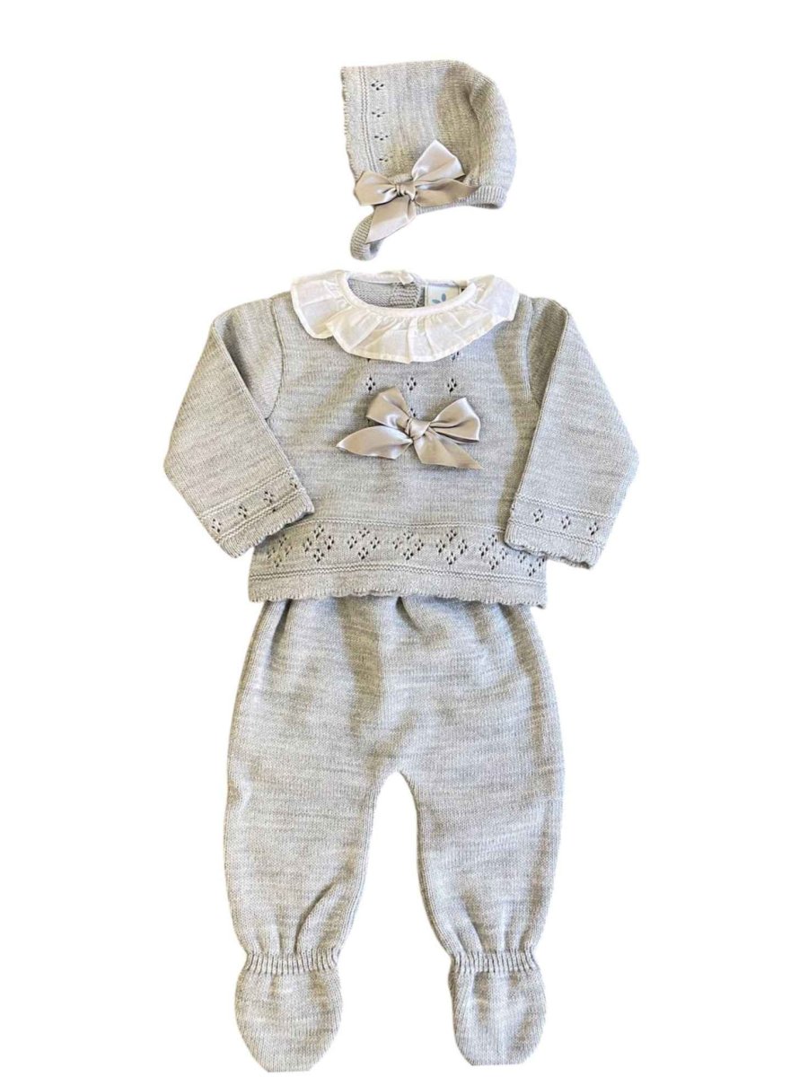 Completo 3 pezzi in misto lana: maglia con fiocco e collettino bianco, ghettina e cuffietta con applicazione fiocco in raso cooridnato