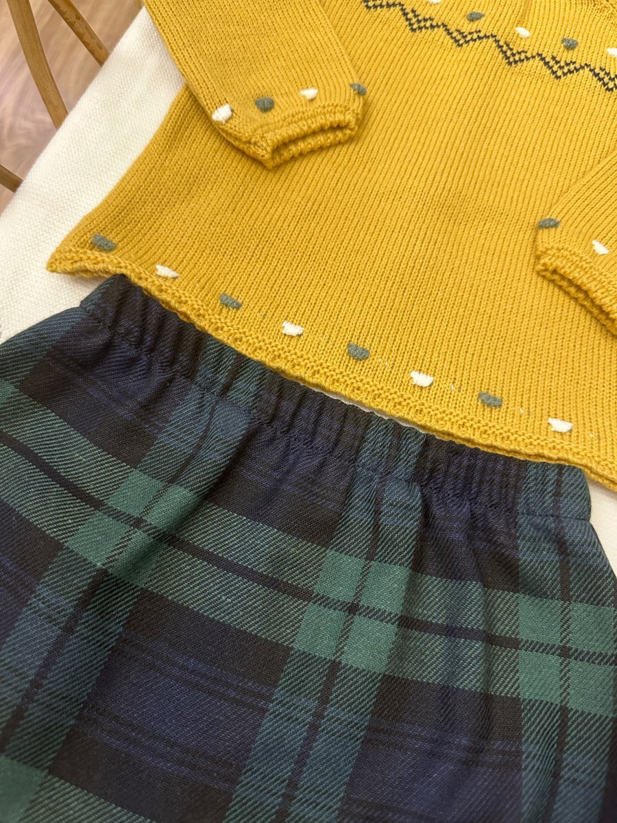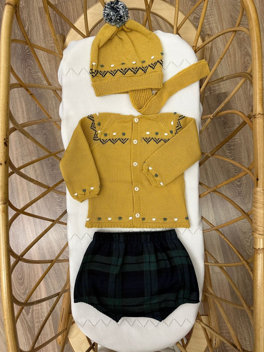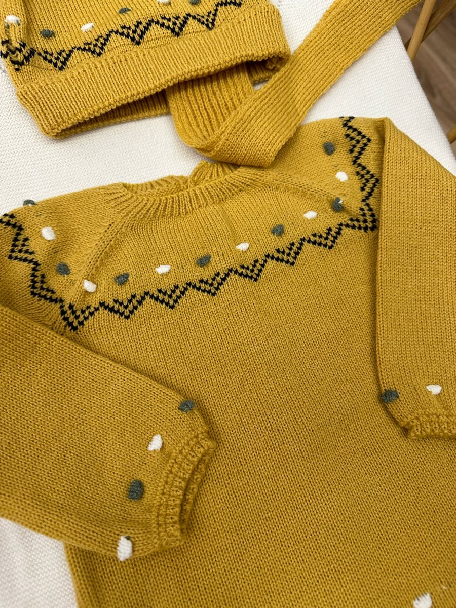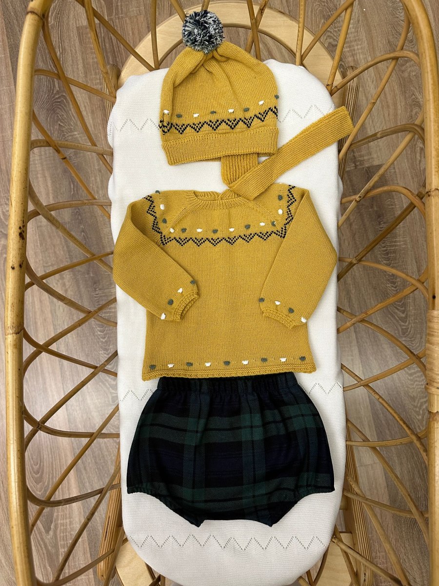 Completo 3 pezzi: maglioncino senape con ricami bianchi, blu e verdi in misto lana, con bermuda e cappellino giallo con pom pom