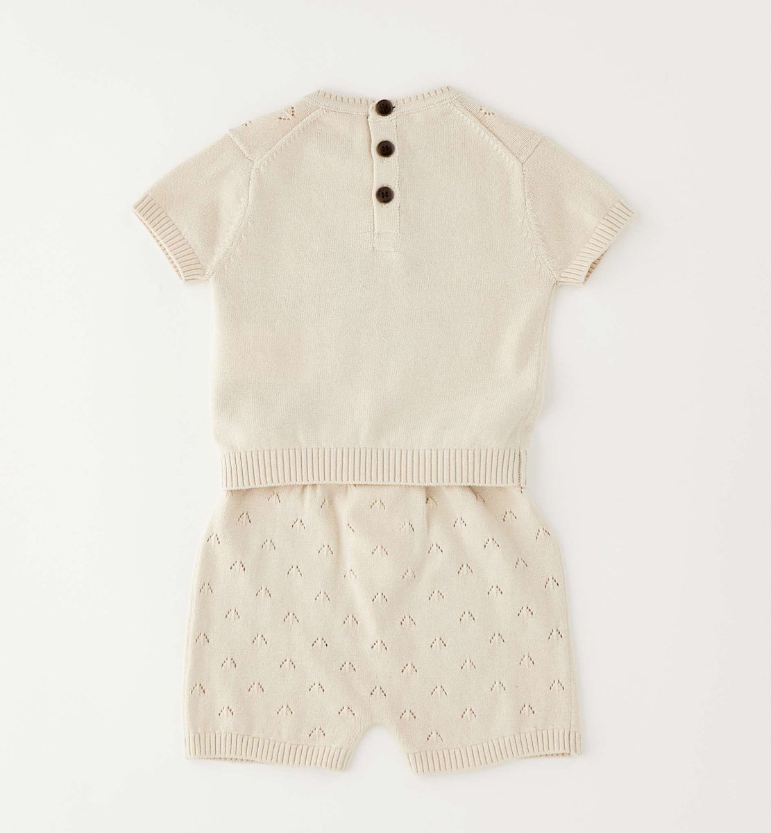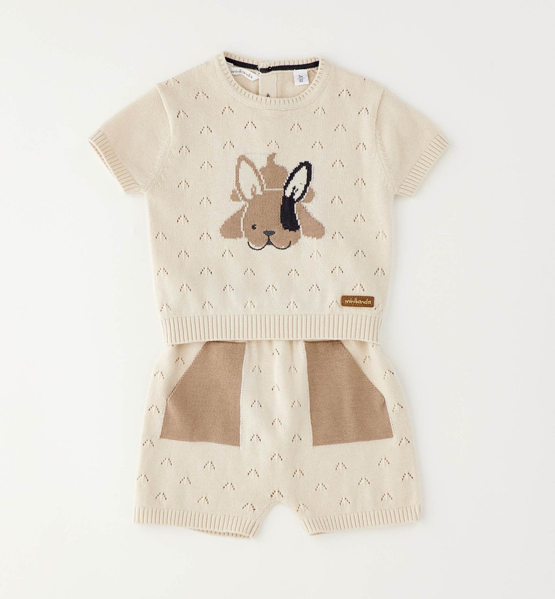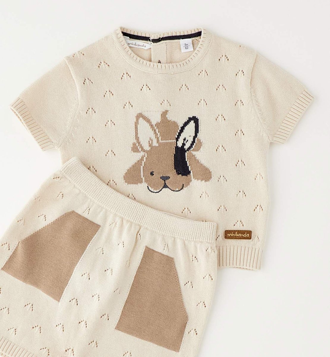 Completo in filo di cotone colore beige: maglia a manica corta con ricamo cagnolino e pantaloncino coordinato con tasche marroni.