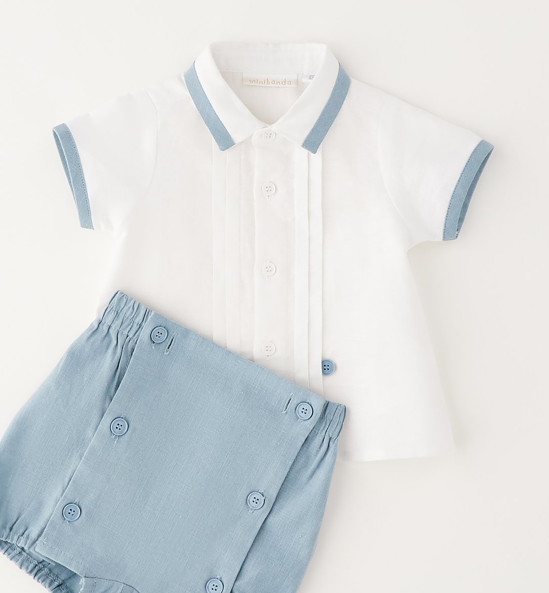 Completo due pezzi, camicia in lino bianca, a mezza manica con bordo carta da zucchero, pantaloncino con elastico in vita, bottoncini applicati sul davanti, con asole per poter unire la camicia al pantaloncino.