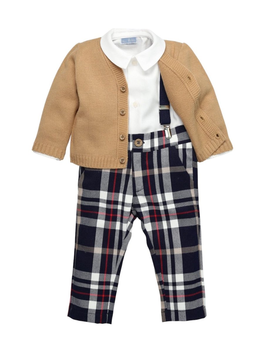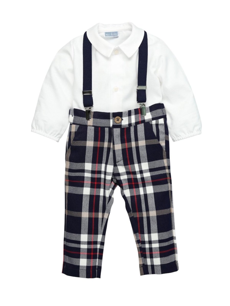 completo mac illusion composto da pantalone tartan in cotone regolabile in vita, camicia bianca con abbottonatura nella parte anteriore e cardigan beige con collo a V e abbottonatura nella parte anteriore (le bretelle non sono incluse)