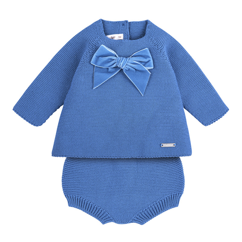 Completo 2 pezzi (maglia + culotte) in cotone con fiocco in velluto colore azzurro francese