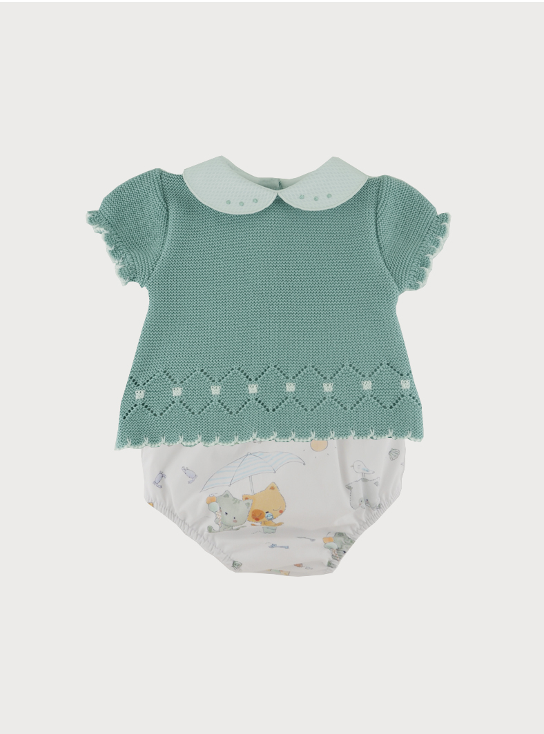 Completo due pezzi: maglia verde acqua con colletto e dettagli bianchi e culotte fondo bianco con stampa animaletti