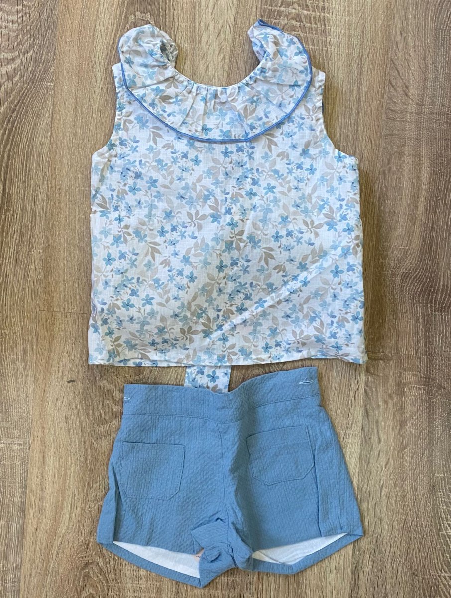 Short in cotone colore celeste con taschini e camicina in cotone a fiori bianca e celeste con balza e fiocco sul retro