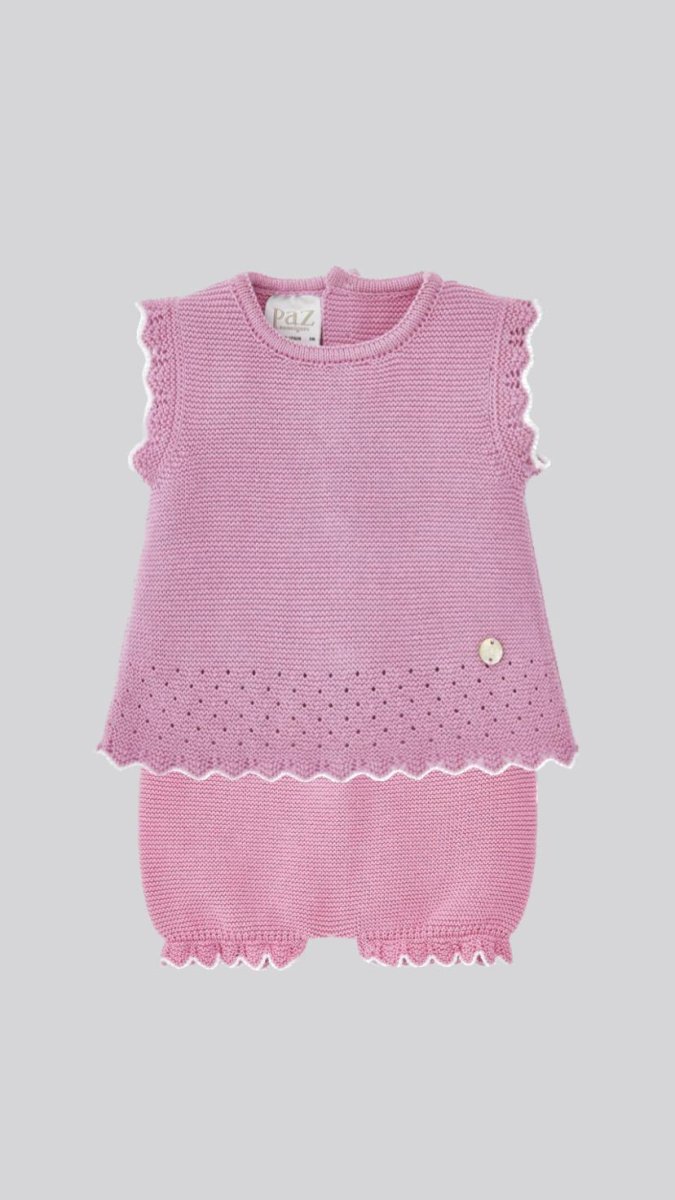 Completo due pezzi in cotone organico: maglia smanicata con pantaloncino rosa forte con ricami bianchi