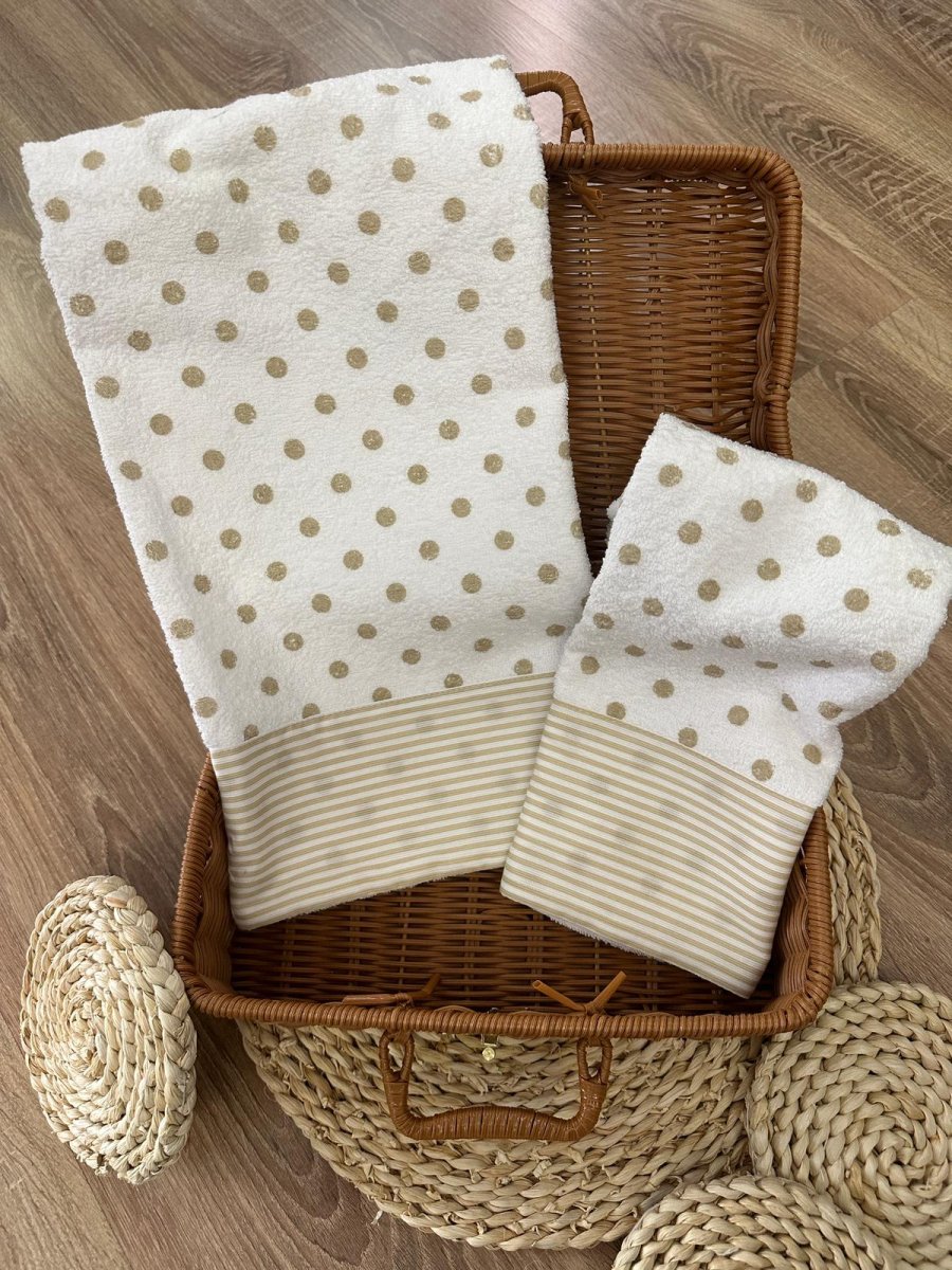 Coppia di asciugamani a pois con fascia rigata beige