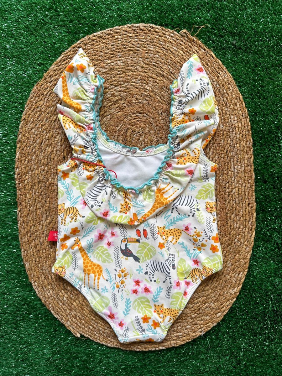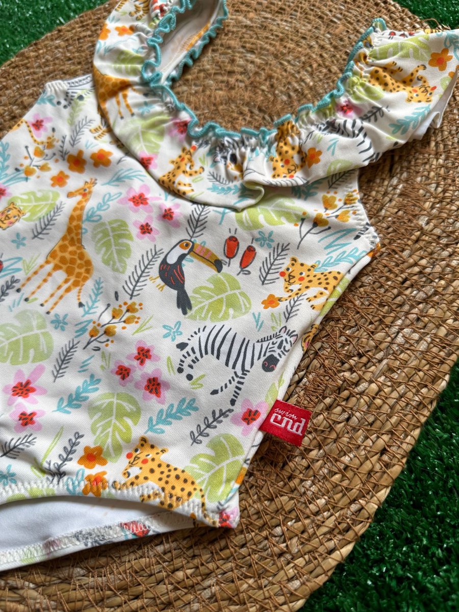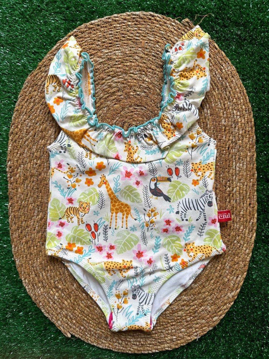 Costume intero bimba Condor con animaletti, con balza e cucitura celeste