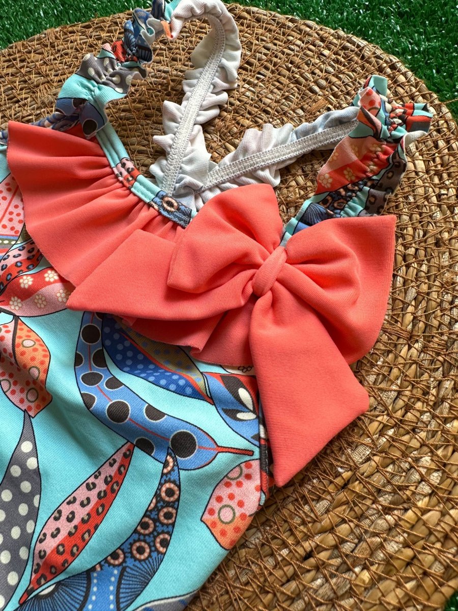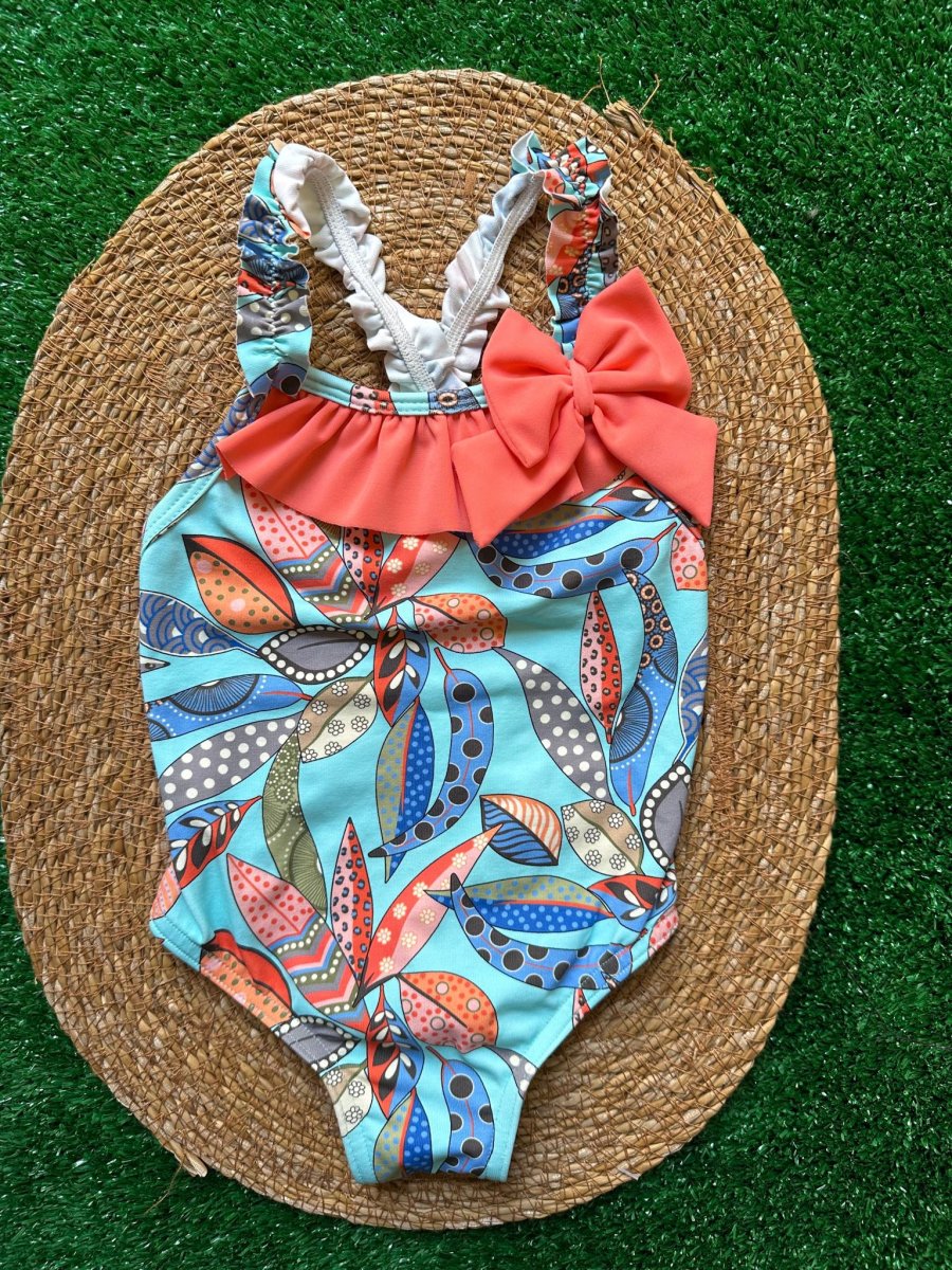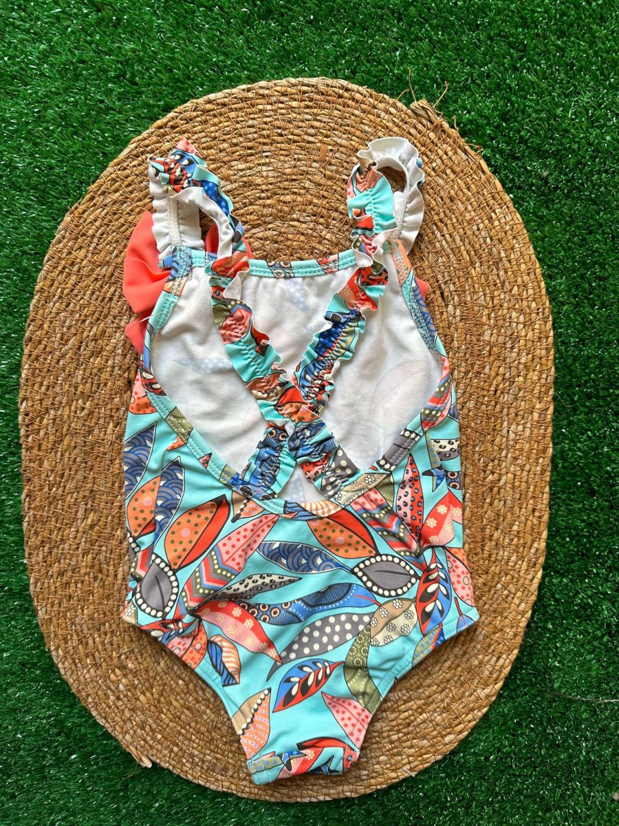 Costume intero Sardon con foglie colorate con balza a fiocco corallo