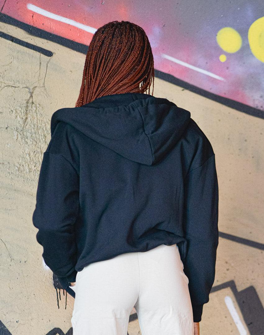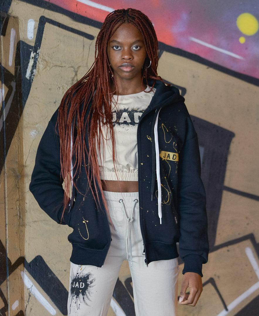Chiusura Zip Cappuccio e tasche a marsupio Pittura JAD logo e spruzzi dipinta a mano Polsino sulle maniche e sul fondo Modello over spalle scese 100% Cotone garzato Made in Italy
