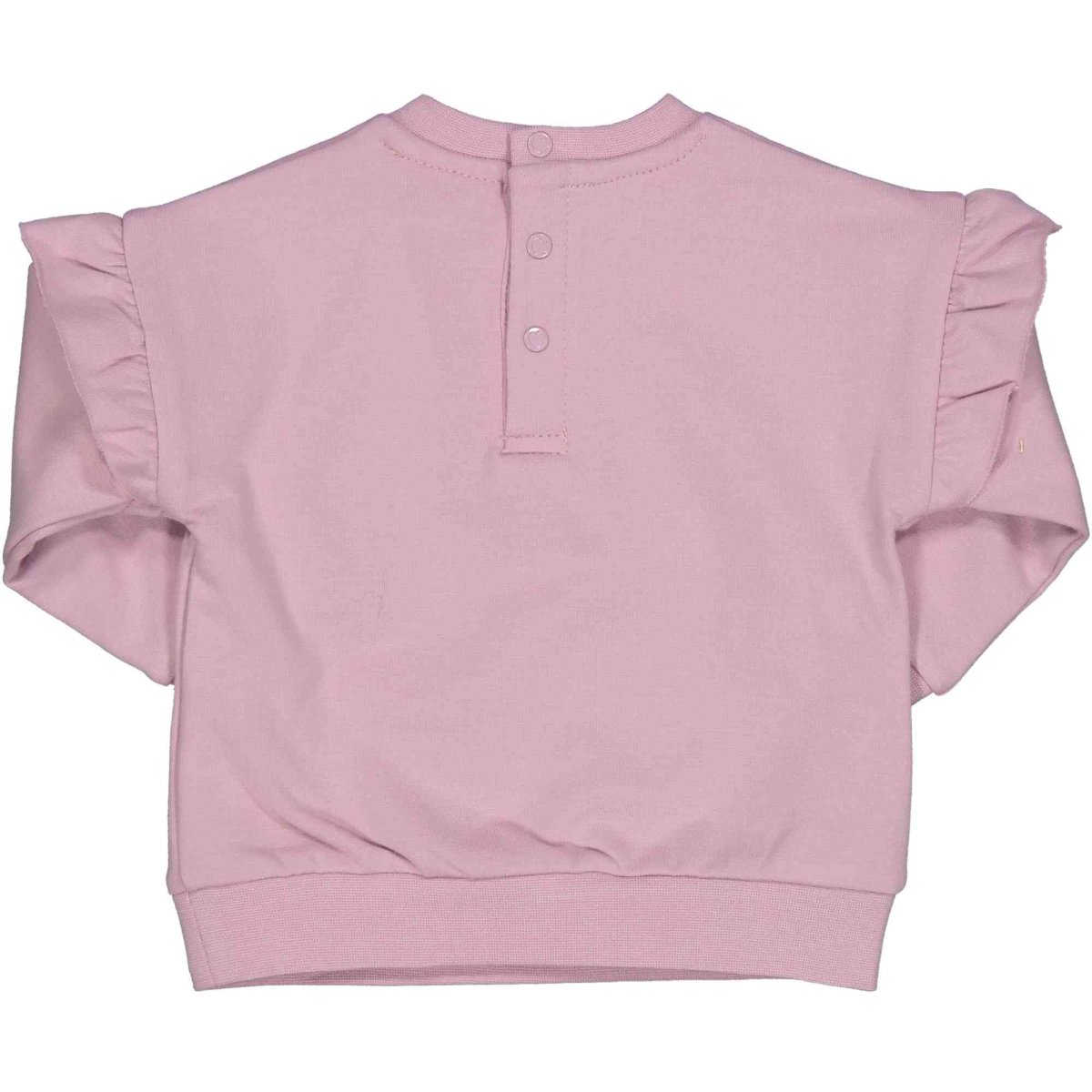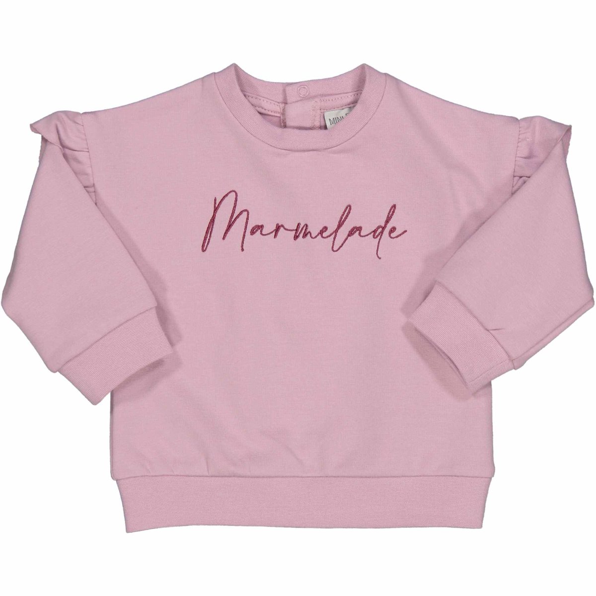 Felpa con ricamo sul davanti “Marmelade”, colore rosa antico, abbottonatura sul retro e rouche sulle spalle
