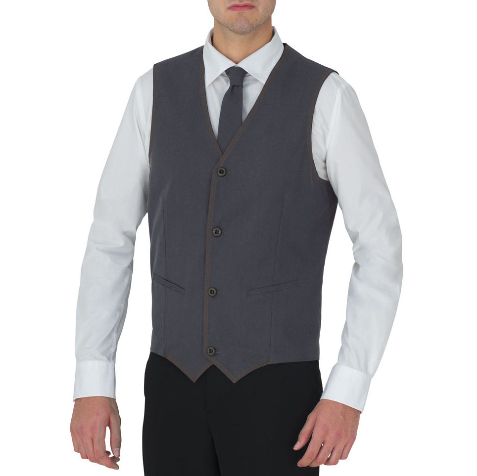 Gilet uomo da servizio, modello moderno, leggero, con impunture a contrasto tipo jeans. Il tessuto in cotone 67% รจ un po’ elasticizzato cosรฌ da poter essere portato aderente senza limitare i movimenti. Presenta 4 bottoni con asola, 2 tasche ed un laccetto sul retro per regolare la vita. Si lava in lavatrice. Per ambienti giovani e dinamici, senza rinunciare all’eleganza. La vestibilitร รจ “slim”.