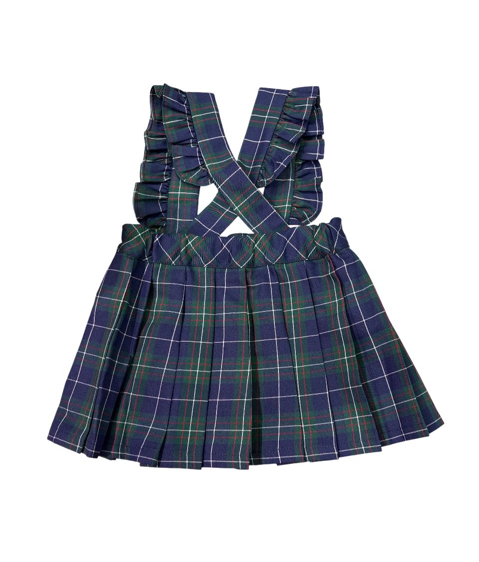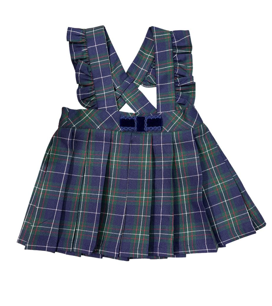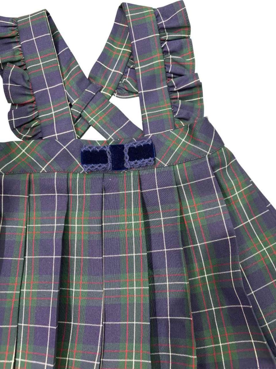 Gonnellina a pieghe con vita regolabile con fondo blu fantasia tartan e bretelle rimovibili e applicazione fiocchetto in velluto sulla parte anteriore.