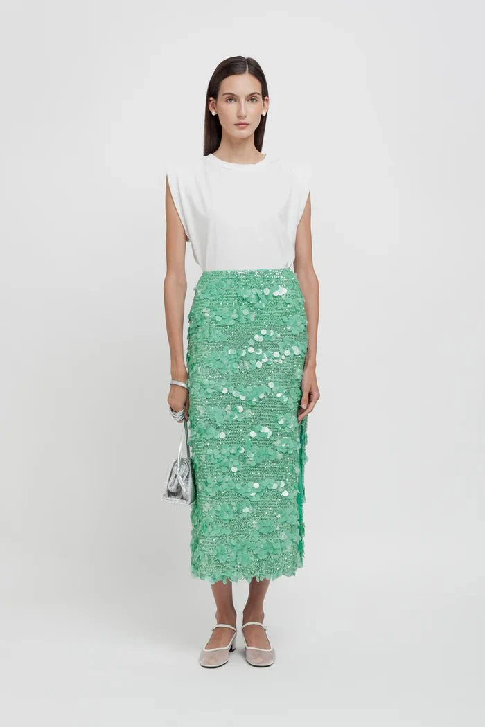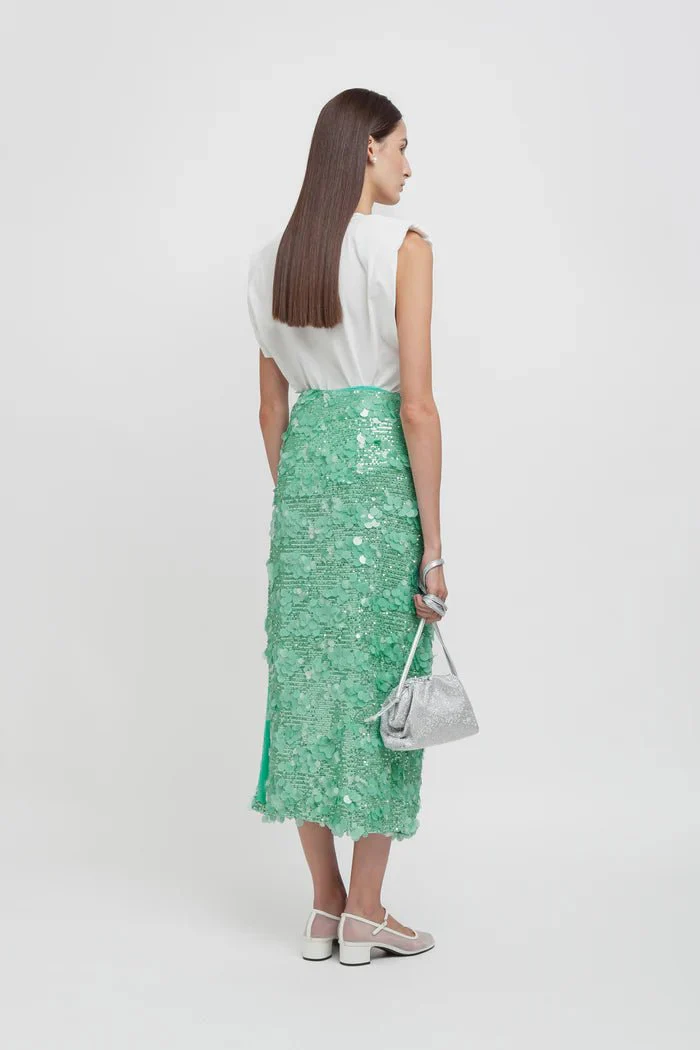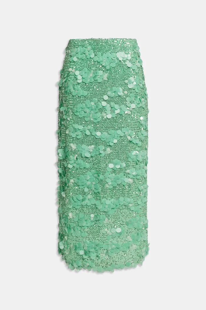 Gonna longuette verde acqua in paillettes con spacco laterale