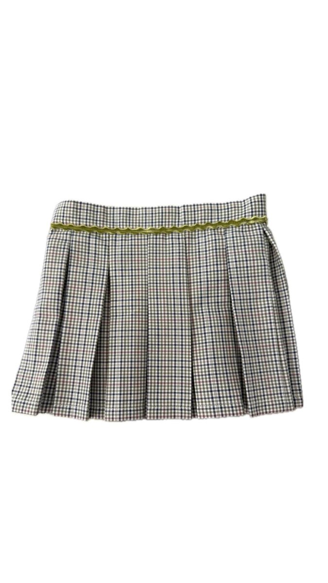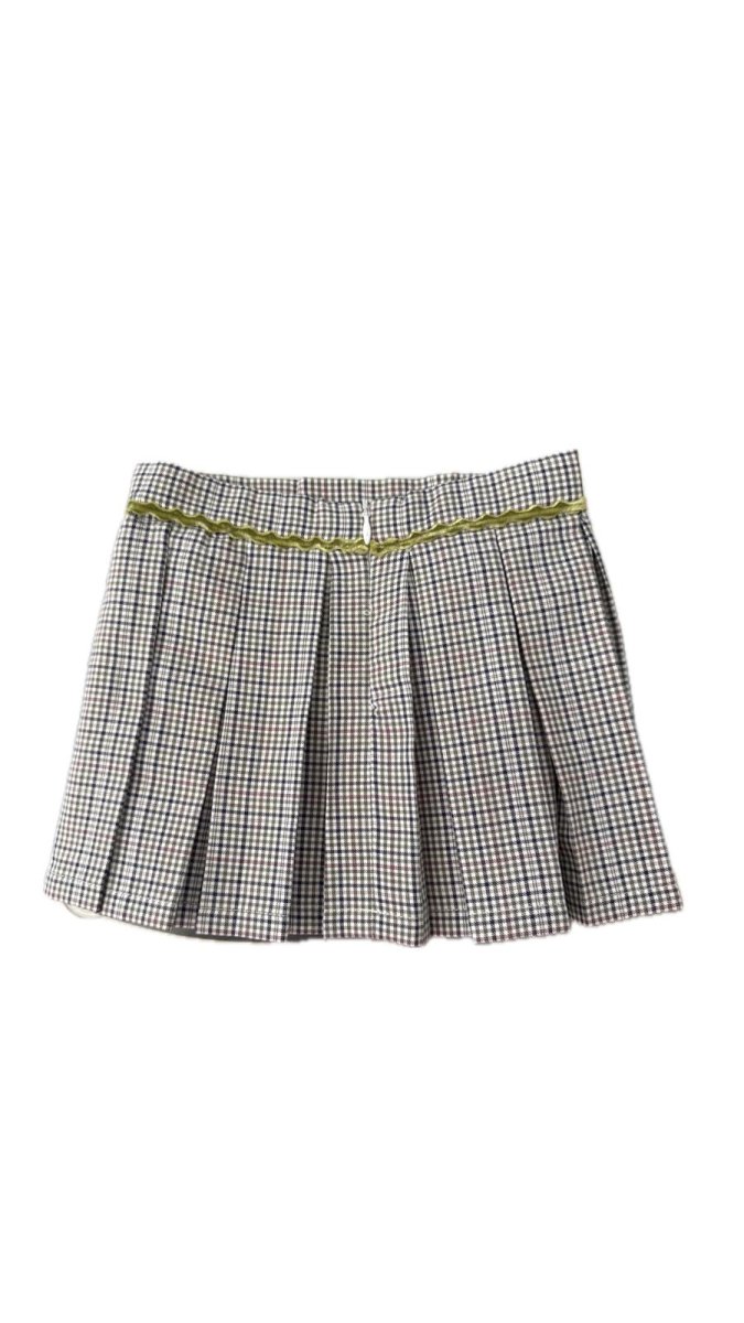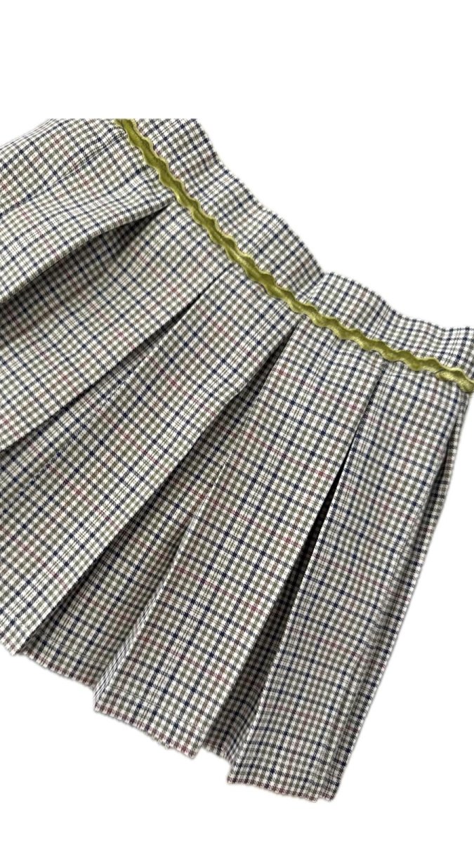 Gonnellina in cotone fantasia quadretti, fondo bianco e quadretti blu, verdi, rossi, con bordino verde in velluto ondulato nella parte superiore, regolabile internamente, abbottonatura con zip nella parte retrostante centrale