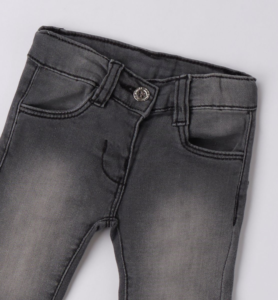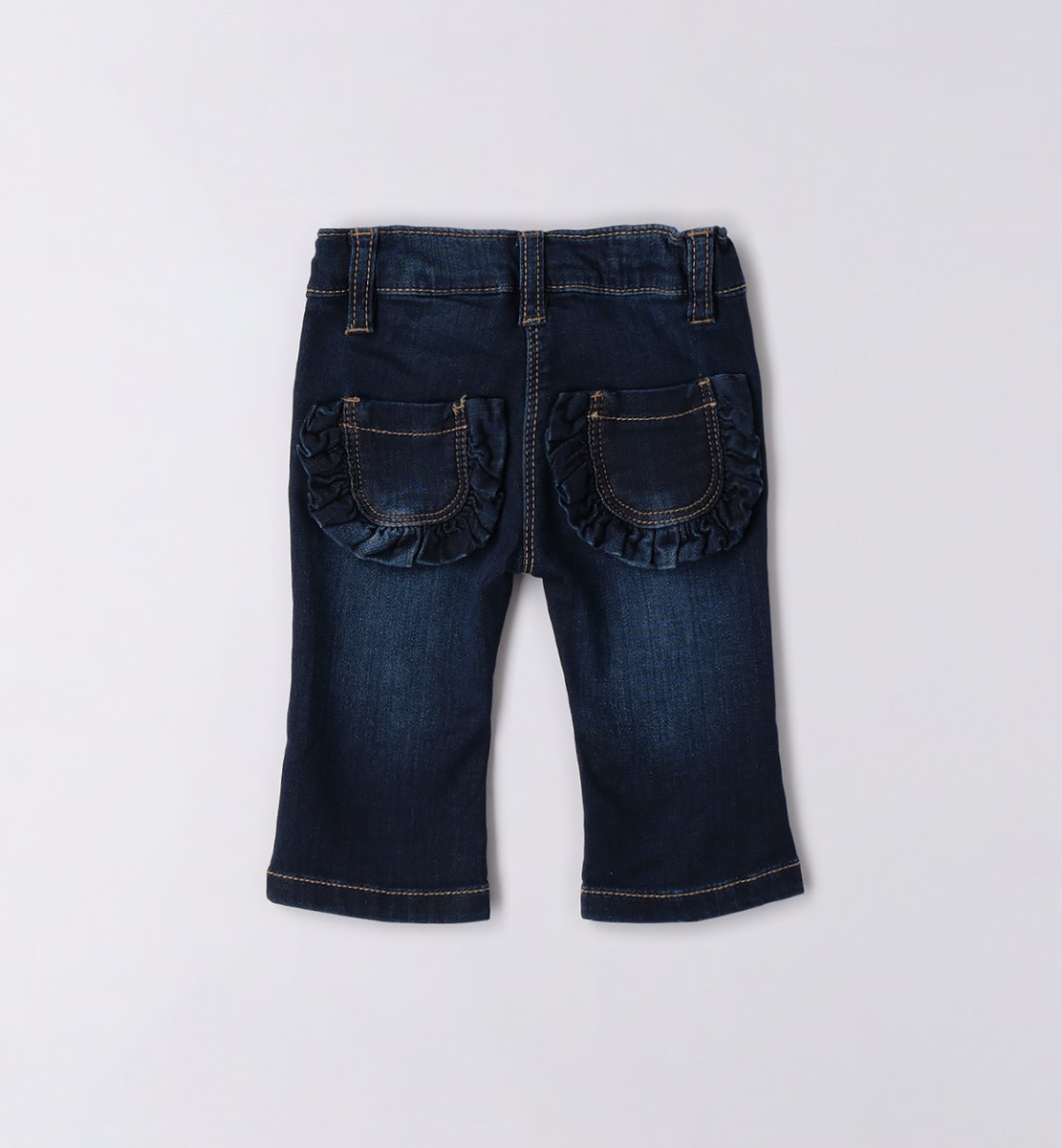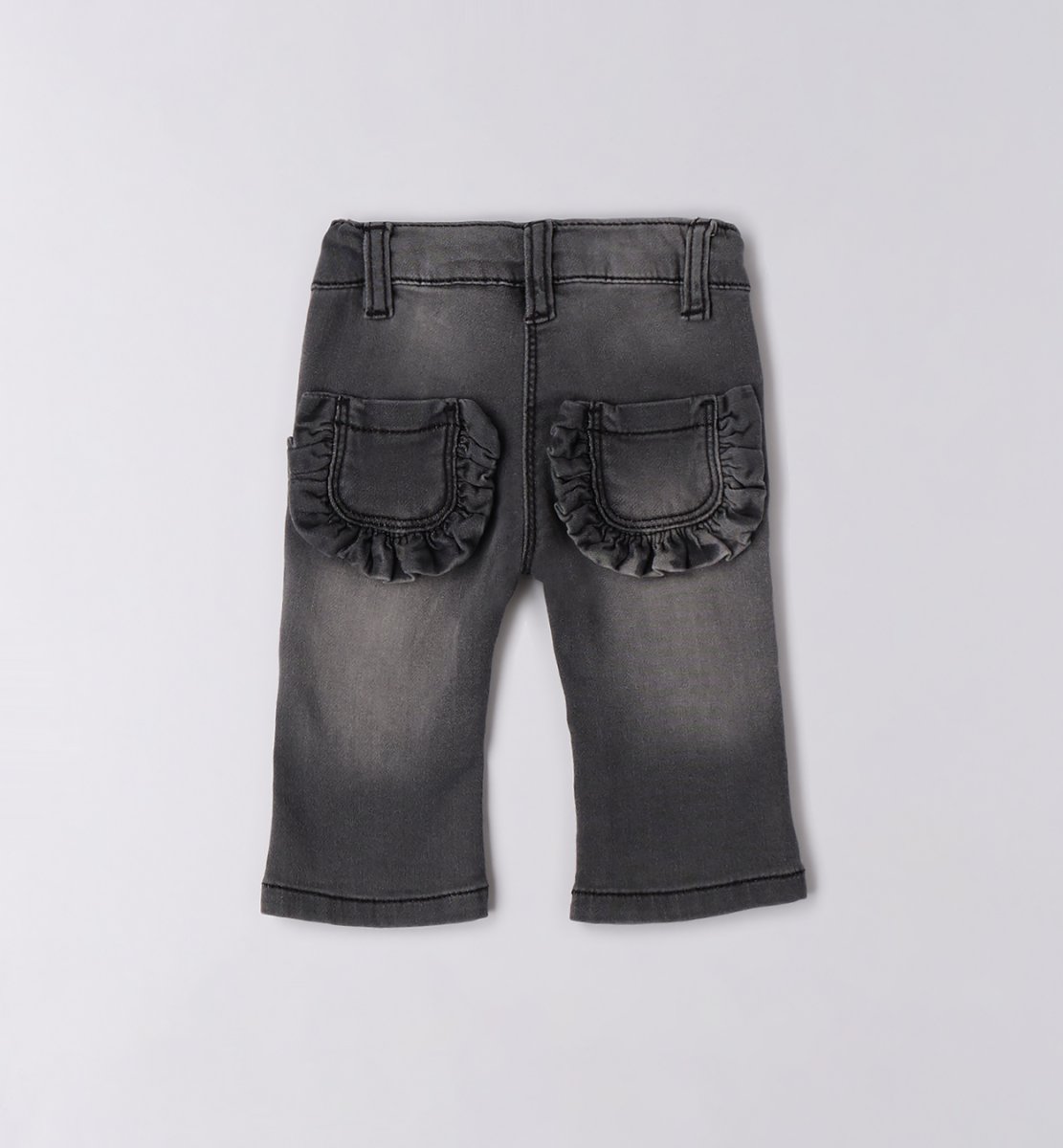 Jeans a trombetta con chiusura bottoncino e tasche posteriori con rouches