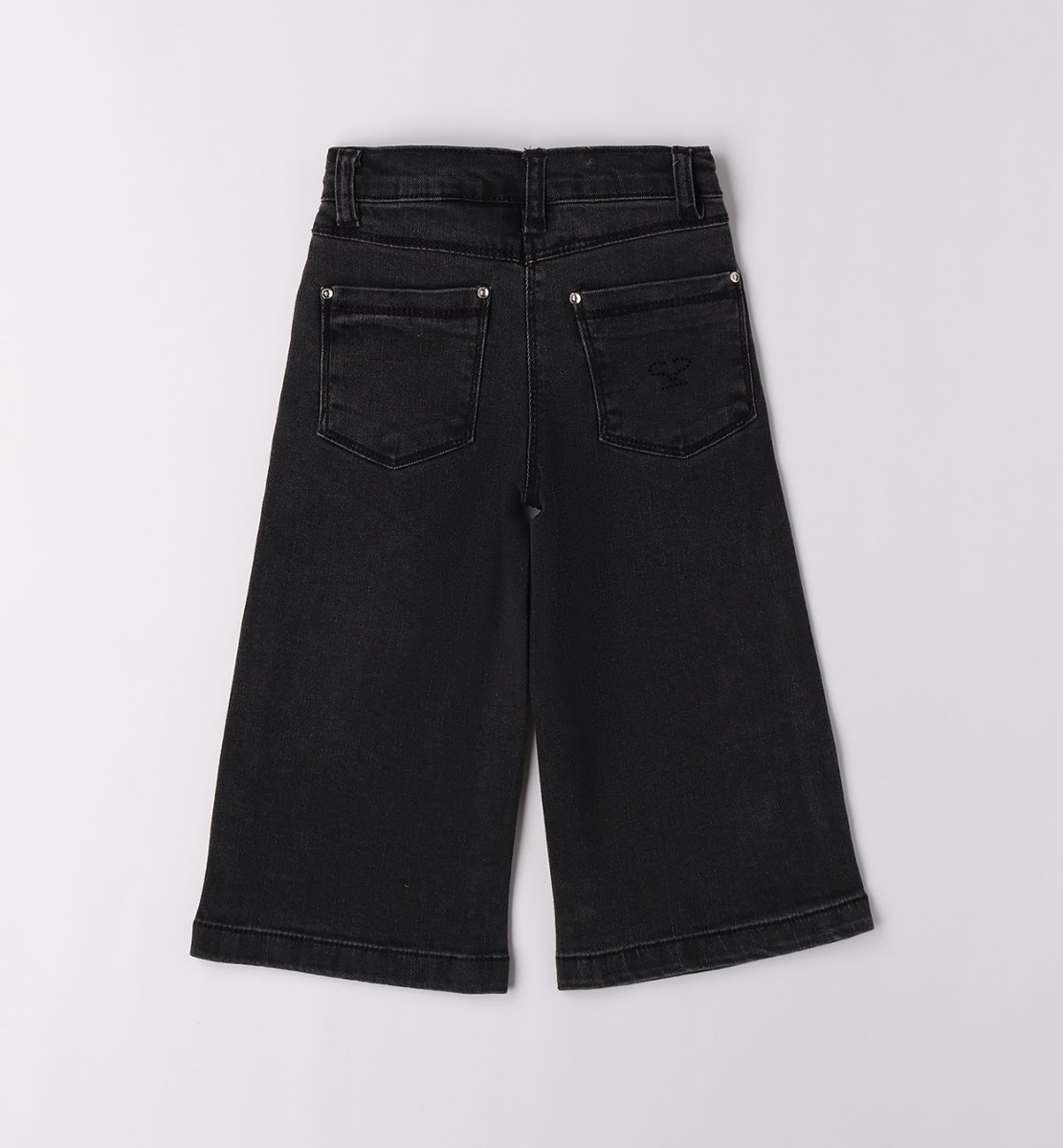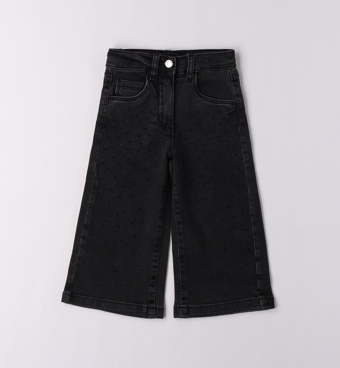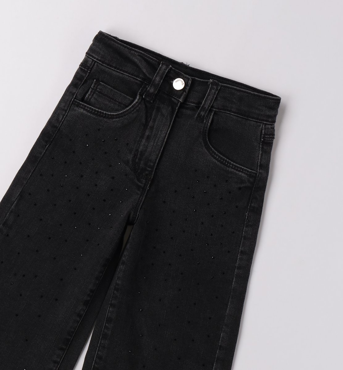 Jeans colore nero a zampa con vita regolabile e con strass neri sulla parte anteriore