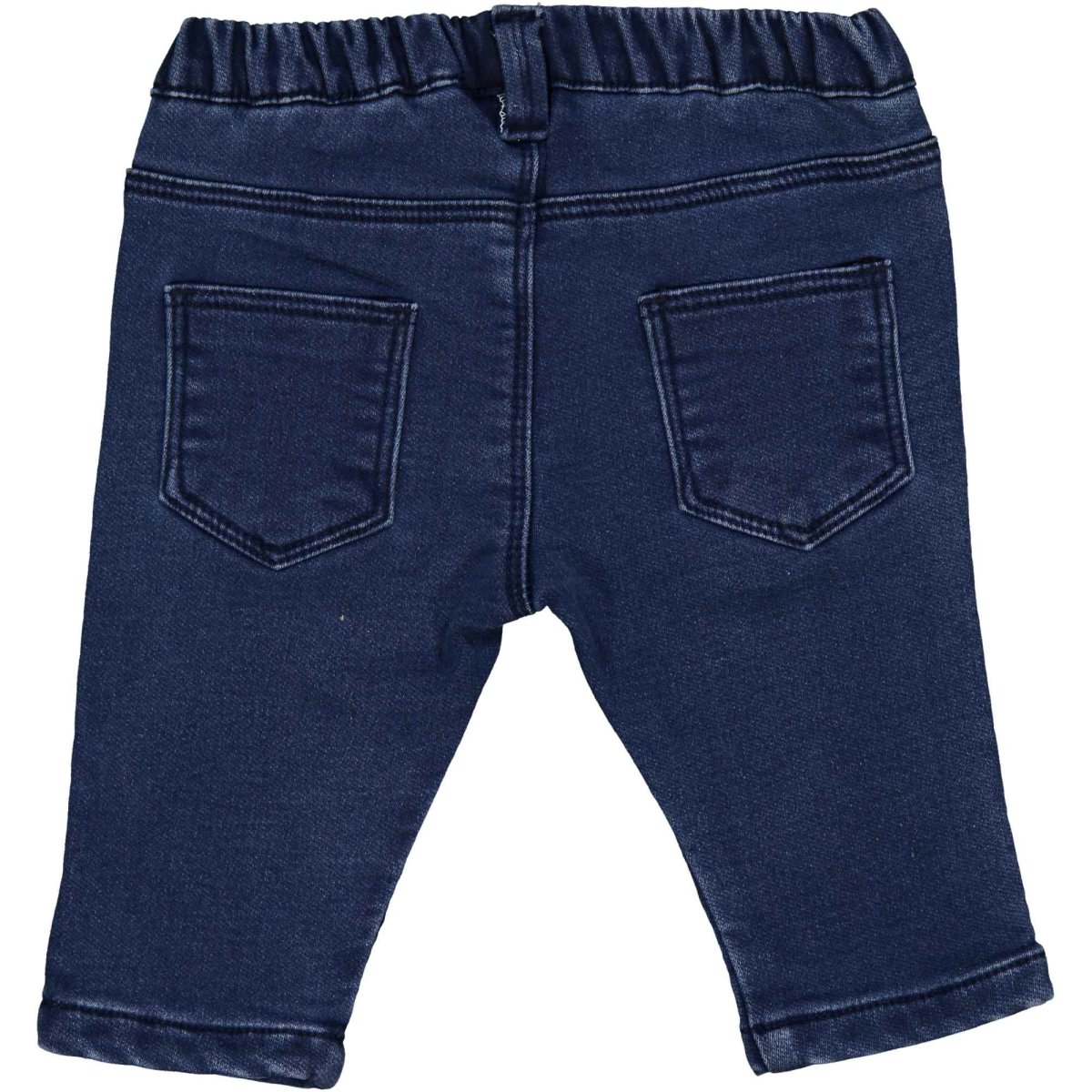 Jeans morbido, modello cinque tasche, blu con bottoncino rosso, elastico in vita
