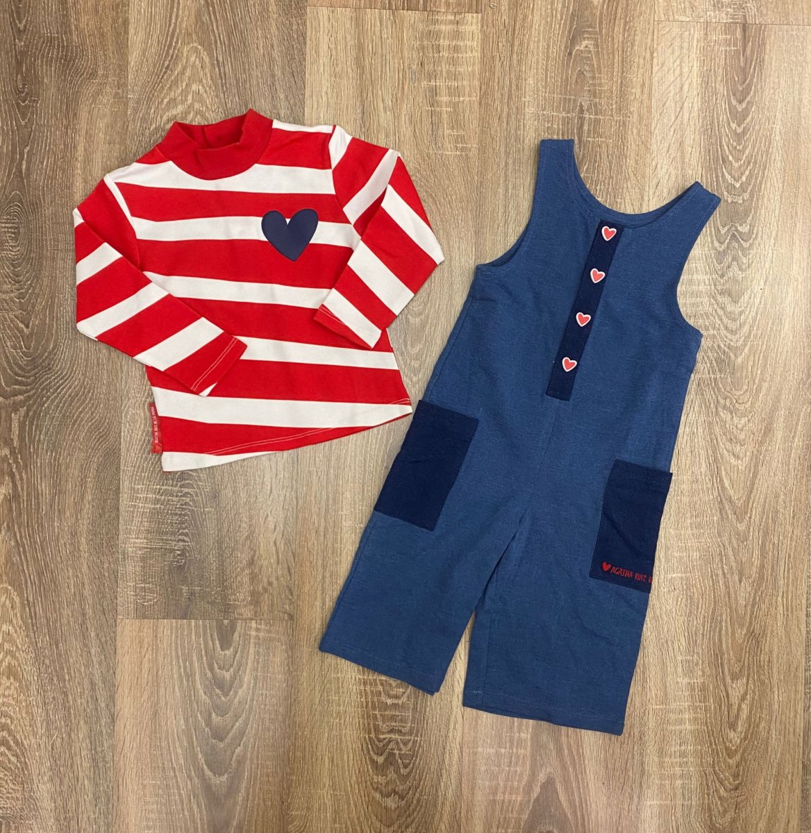 Lupetto in caldo cotone a righe bianche e rosse e salopette denim con bottoncini a cuoricino e tasconi