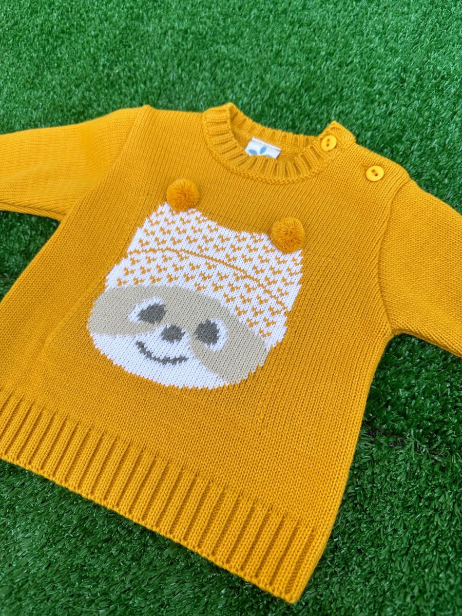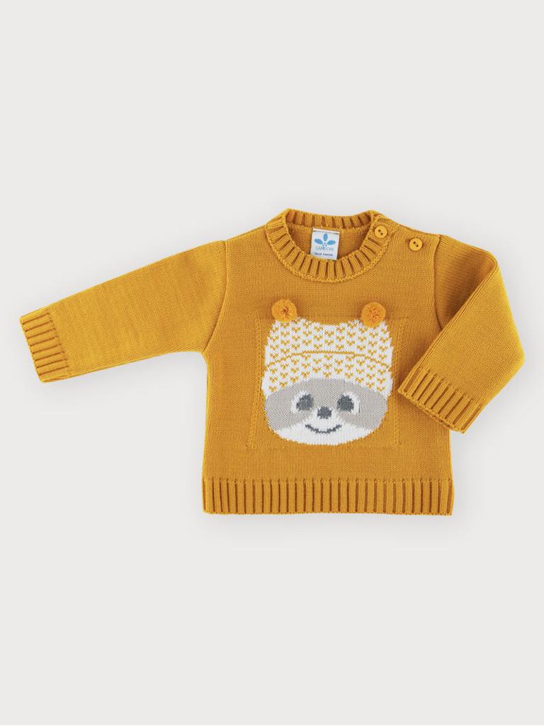 Maglioncino color senape con bottoncini e ricamo orsetto con pom pom