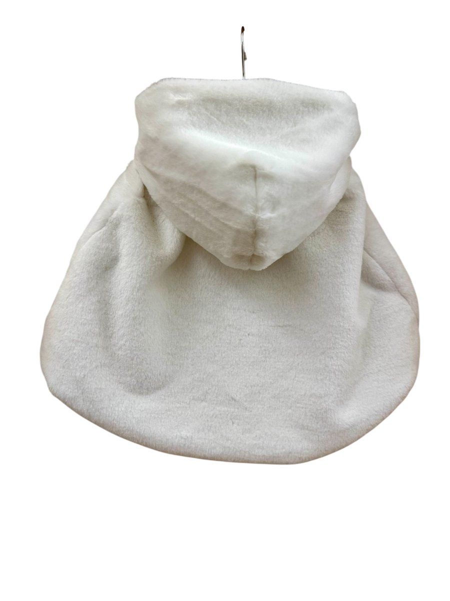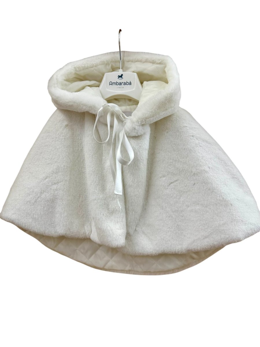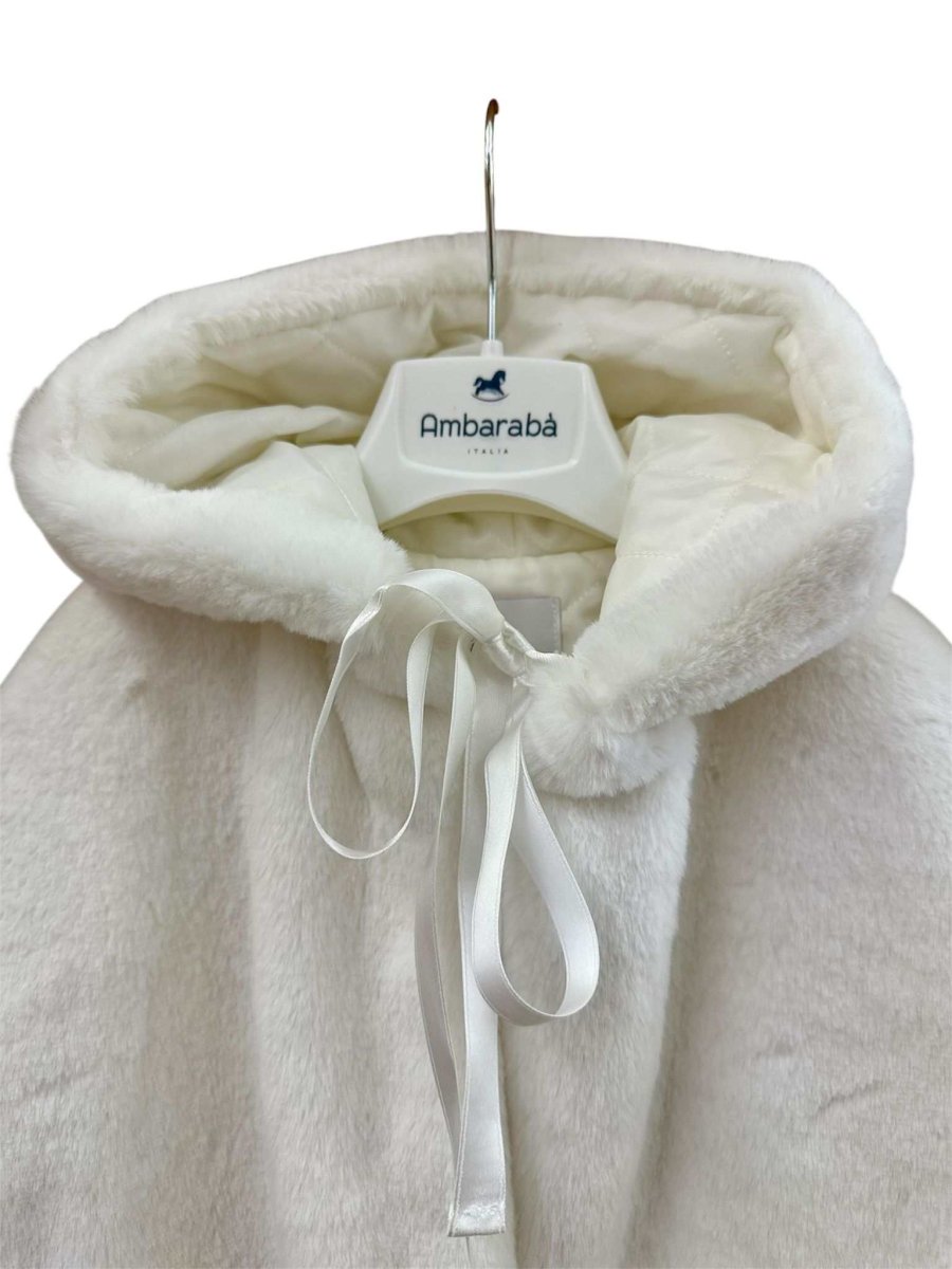 Mantella bianca in pelliccia ambarabà, con imbottitura interna, cappuccio e chiusura con nastro in raso.