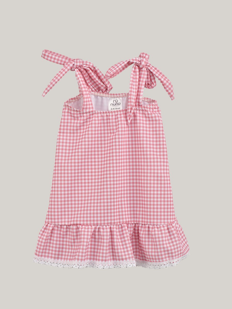 Mini dress con balza, fantasia vichy rosa e bianco, con bretelle fiocco regolabili