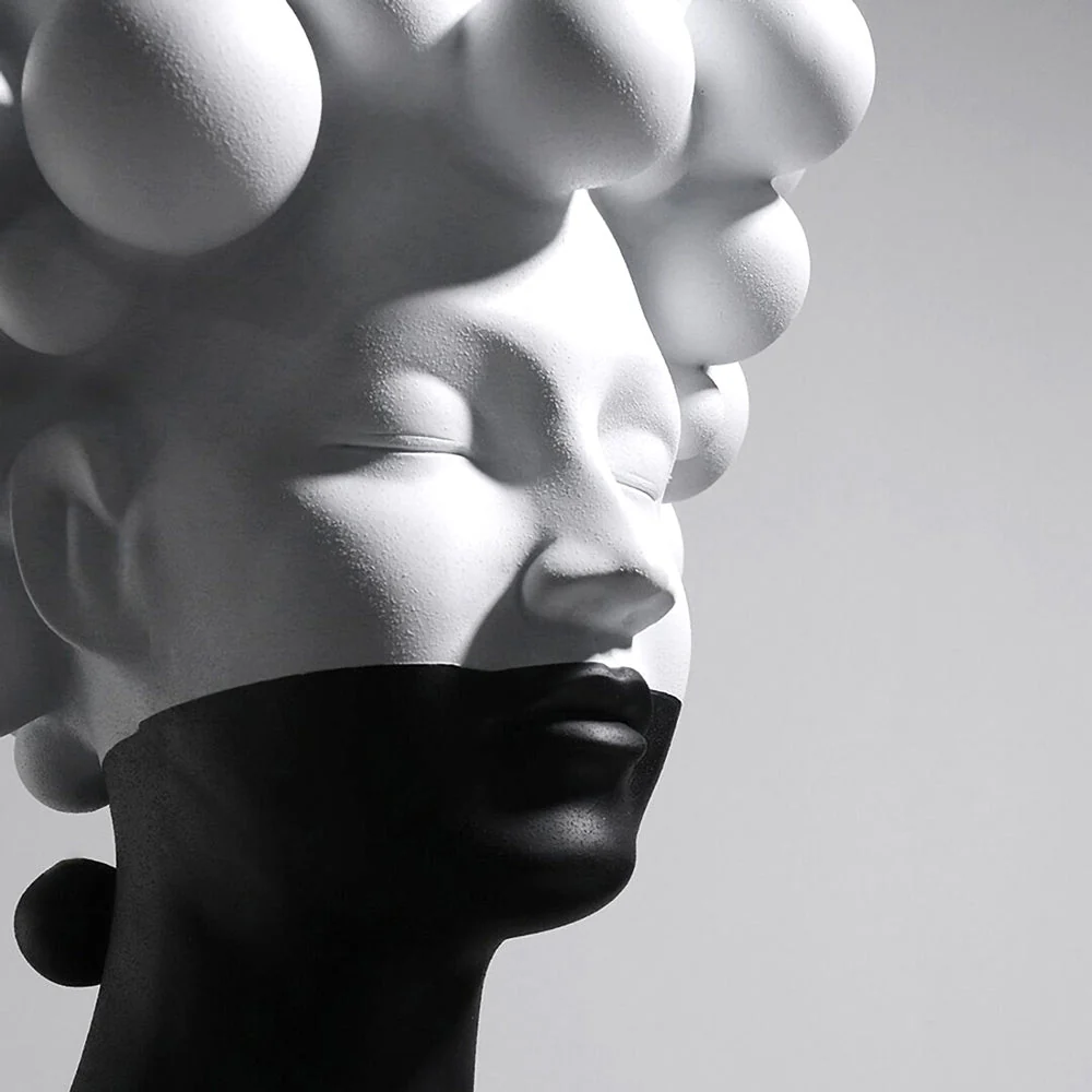 Crafted from premium resin, this luxury decorative sculpture showcases impeccable artistry with its dramatic two-tone design. The pristine white upper portion, adorned with perfectly sculpted spherical shapes, creates a mesmerizing contrast against the deep black lower section. The sculpture’s closed eyes and serene expression add an air of tranquility, while the elongated neck brings a touch of elegance to its modern silhouette.