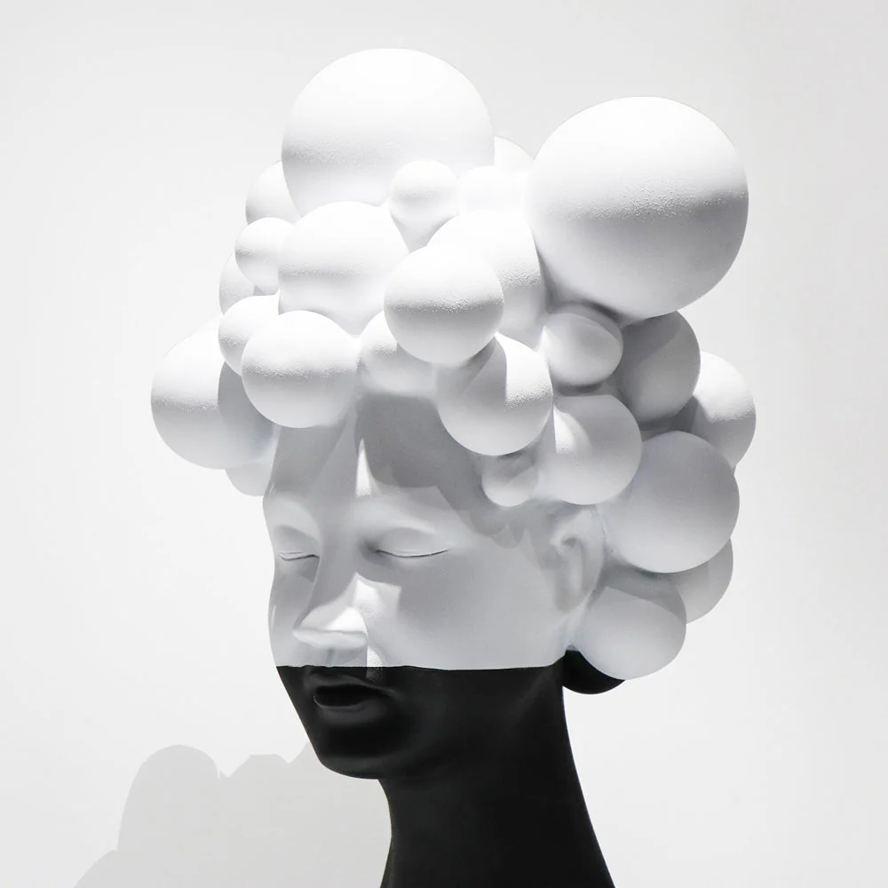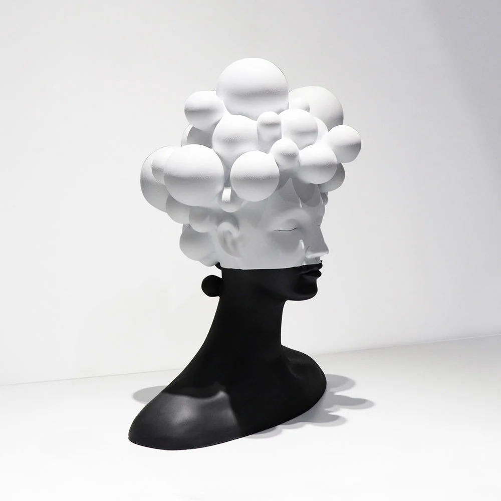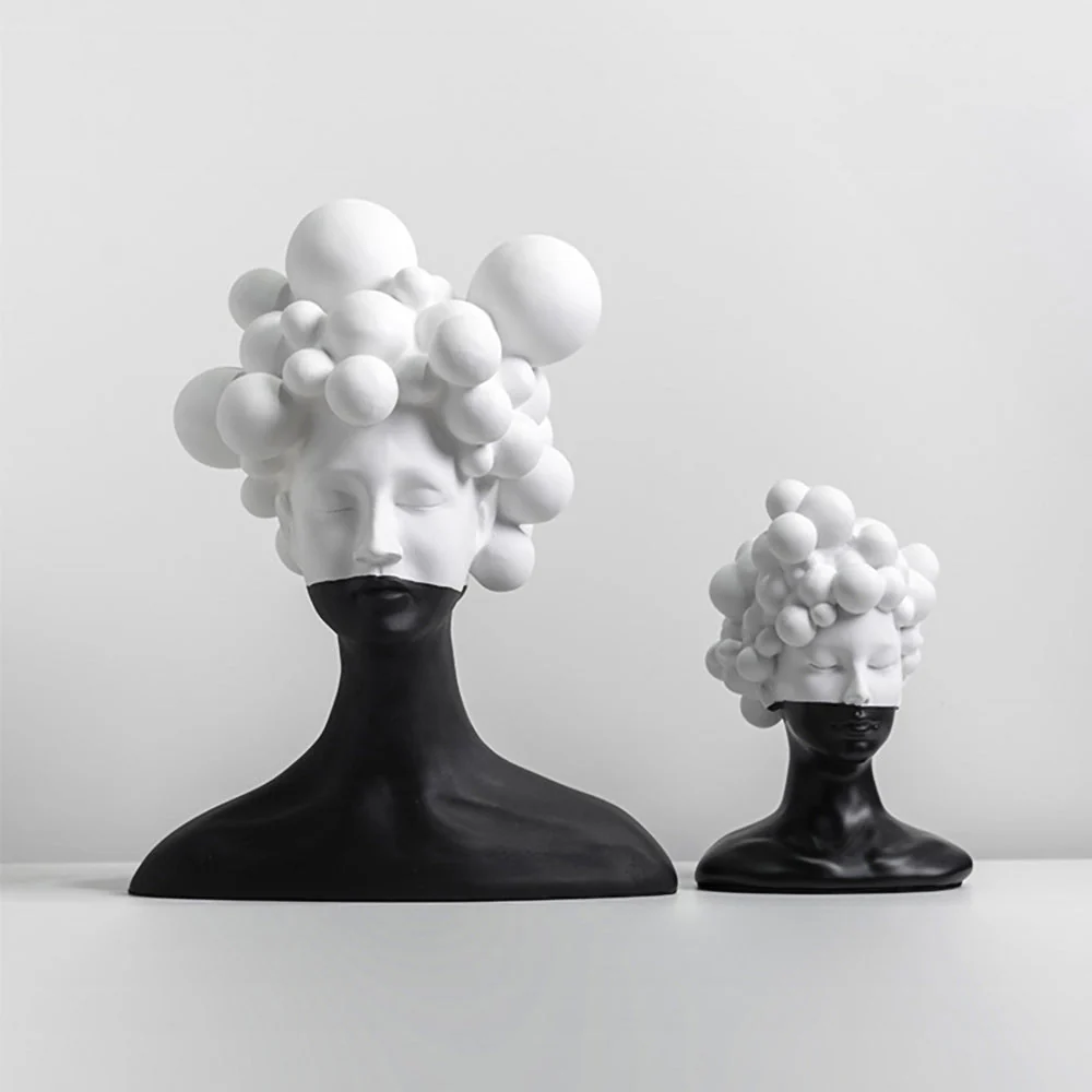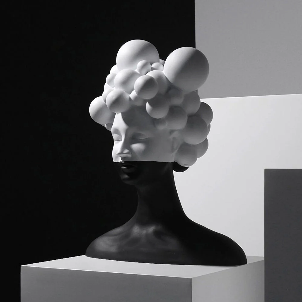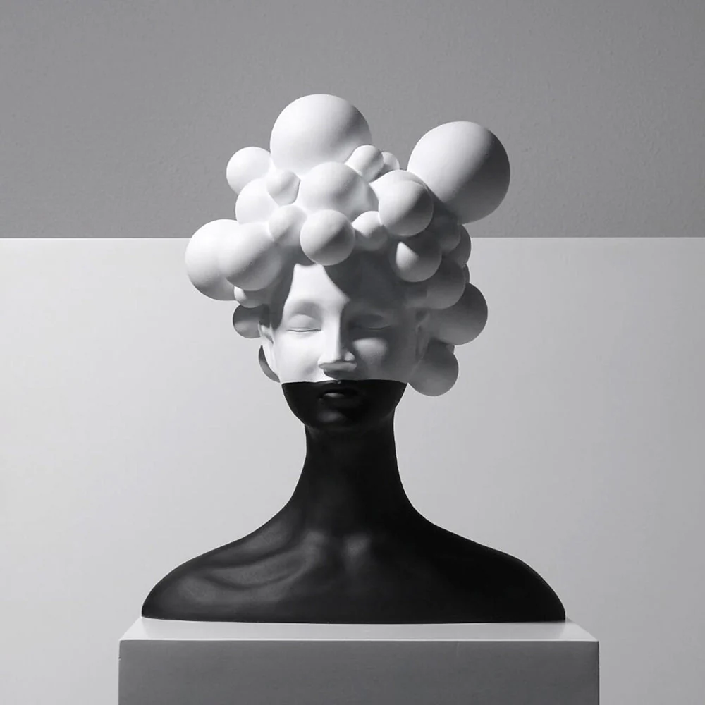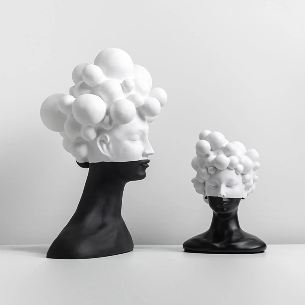 Transform your living space with this striking Modern Woman Head Sculpture, a contemporary masterpiece that seamlessly blends modern aesthetics with artistic sophistication. This exceptional black and white sculpture captures attention through its bold contrast and sculptural elegance, featuring a unique design of spherical elements that create a captivating cloud-like formation atop a sleek, modern bust.